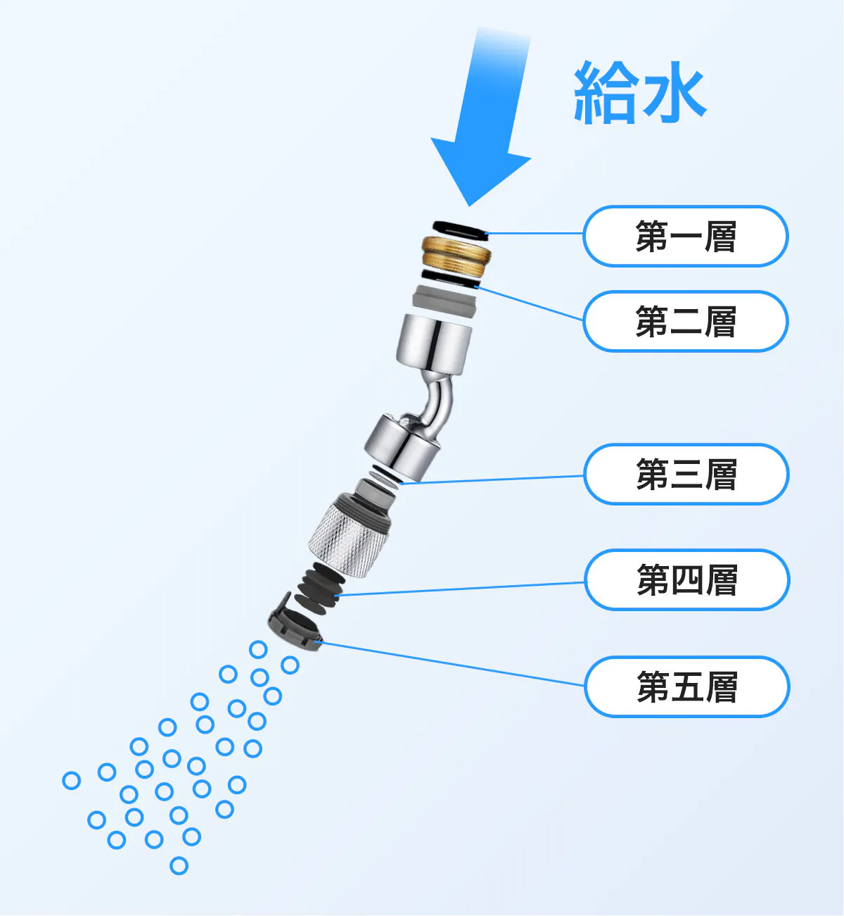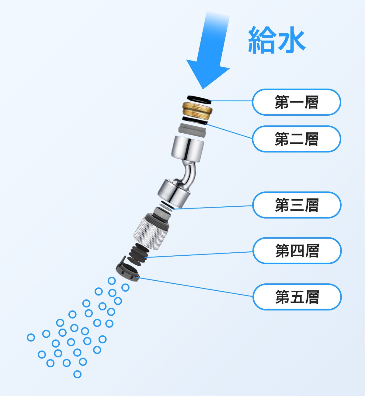 5つのフィルターを設置することで、気泡のせん断し、マイクロバブルが作り出されます。