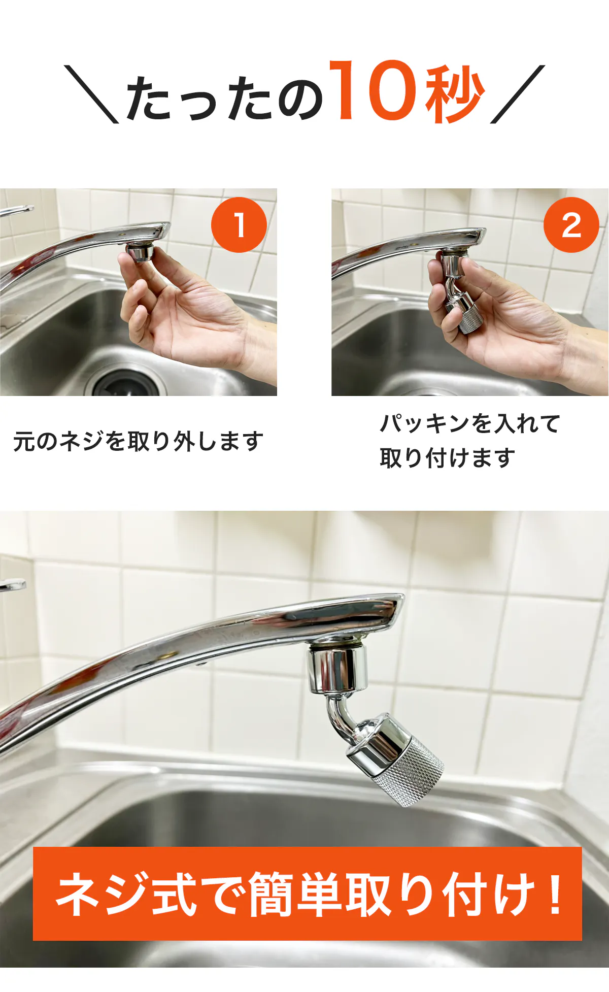 女性や力の弱い方でも、たった10秒で簡単に取り付け可能です。