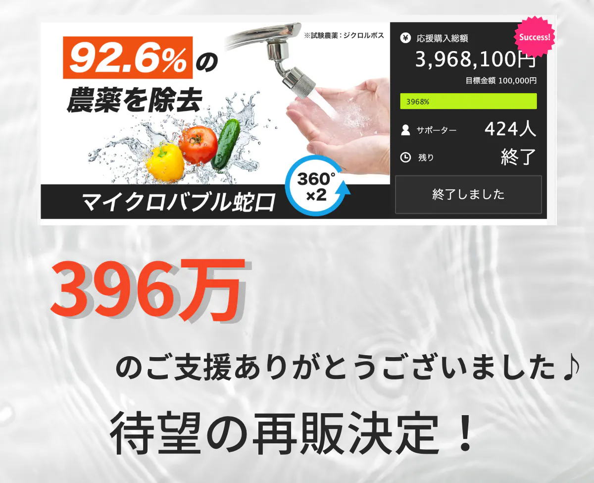 2023/07/03 10:12お世話になっております。この度は、「取り付け簡単!ワンタッチ式マイクロバブルで野菜の農薬洗浄、食器洗い・手洗いに!」のプロジェクトにご支援頂きましてありがとうございました。本日、メーカーに発注いたします。そこから、輸入代行業者に渡り検品終了次第、日本へ輸入する流れになっております。今しばらくお時間いただきますが、どうぞよろしくお願いいたします。 もっと見る