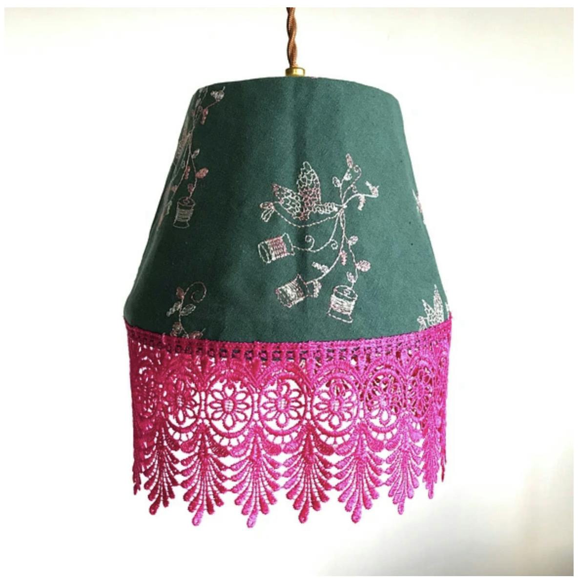 ペンダントランプのシェイド部分の布・・・名前は「イト・トリドリ」。岡山の刺繍レース布アトリエ「音の絵」さんと一緒に(柄のデザインを担当させていただきました)作ったオリジナルファブリックです。打ち合わせなどで訪れた時に感じた「岡山」の空気、色、みなさんとの楽しいおしゃべり・・・そこから発想した、小さな”糸”と”ことり”の物語をデザインした原画を、職人さんたちが丁寧に仕上げてくださった国産刺繍レース布(綿麻地)です。