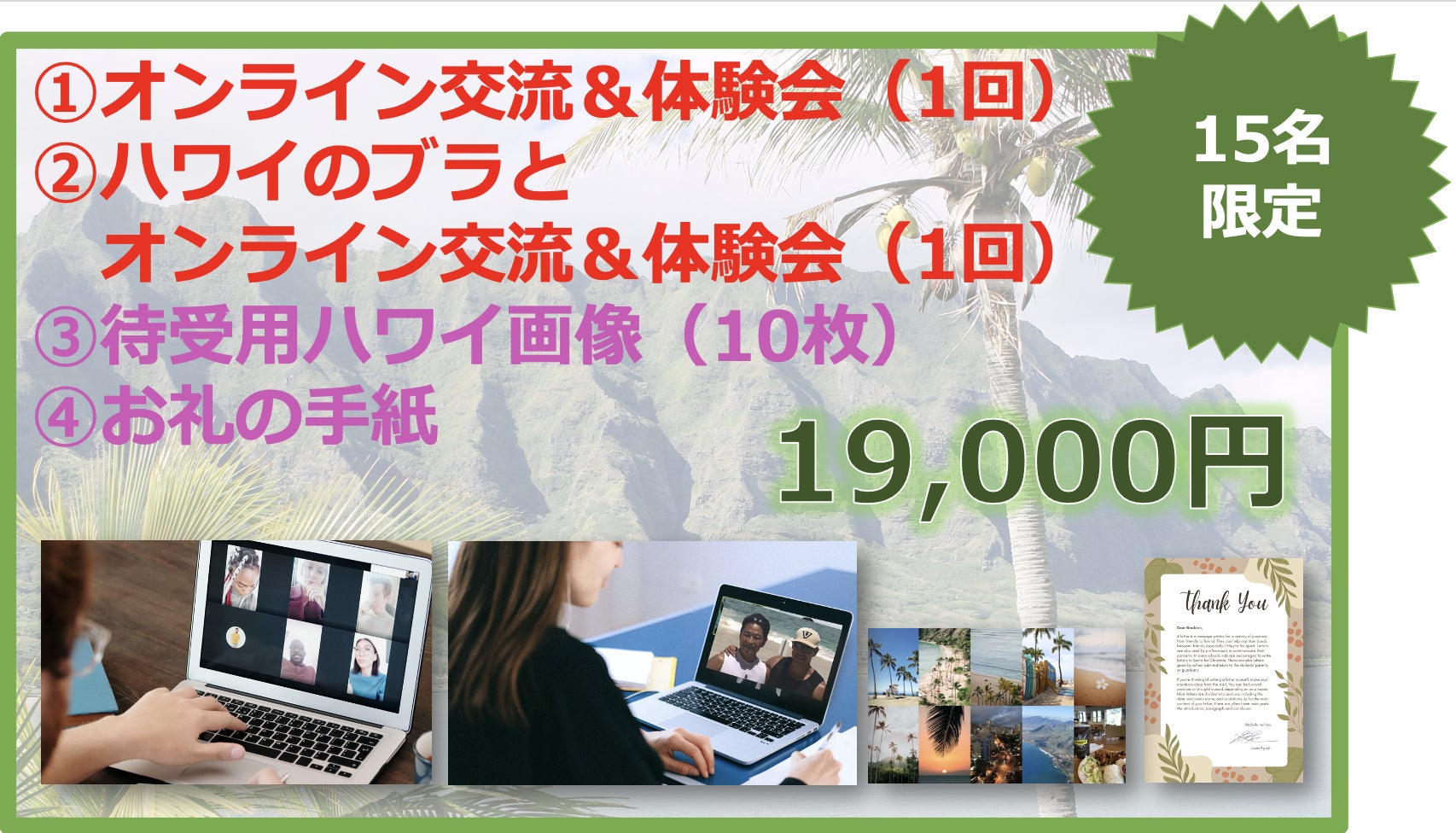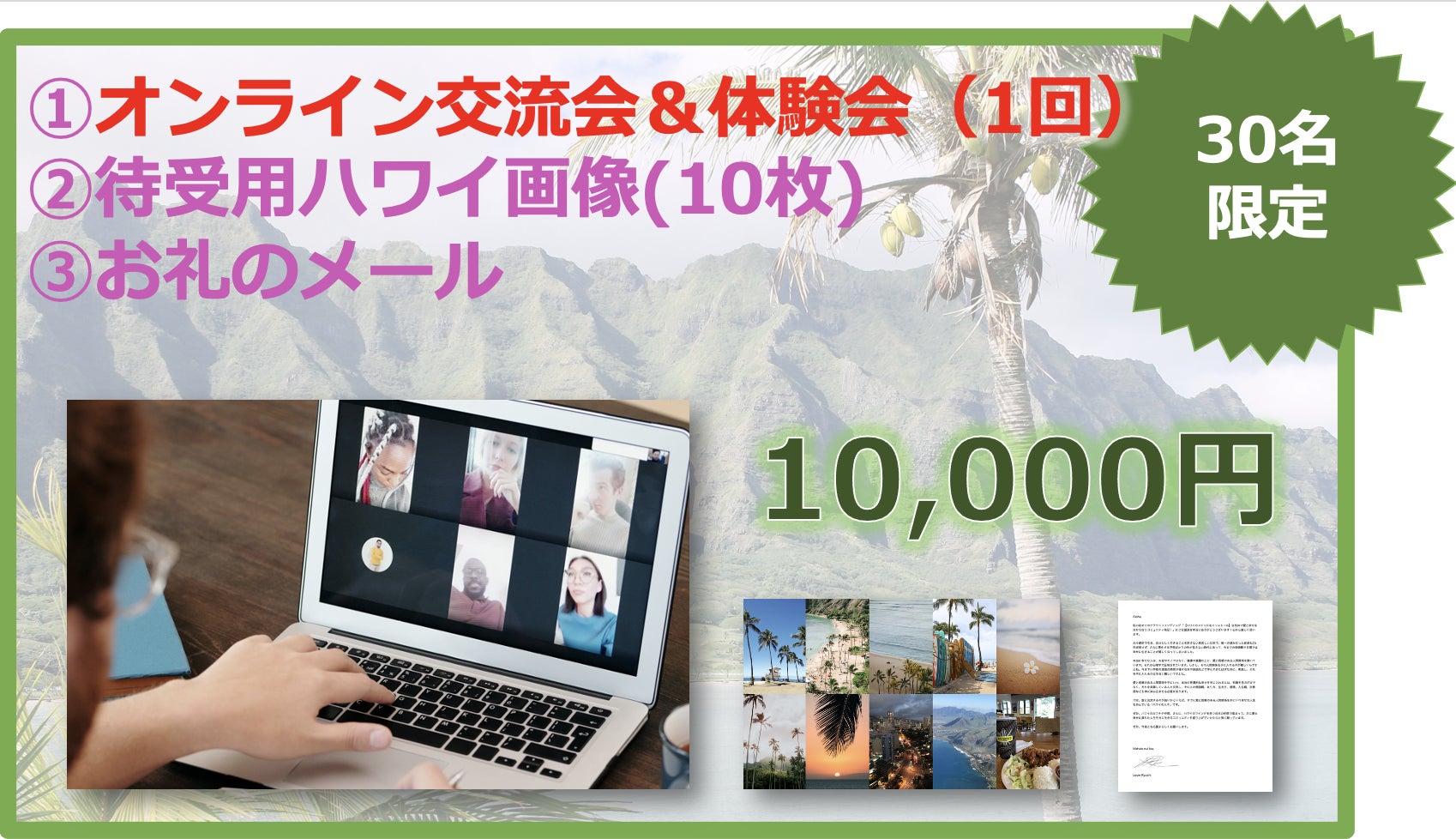 上記の1万円のリターンに加えて、「ハワイのブラとオンライン交流&体験会」が含まれるものです。