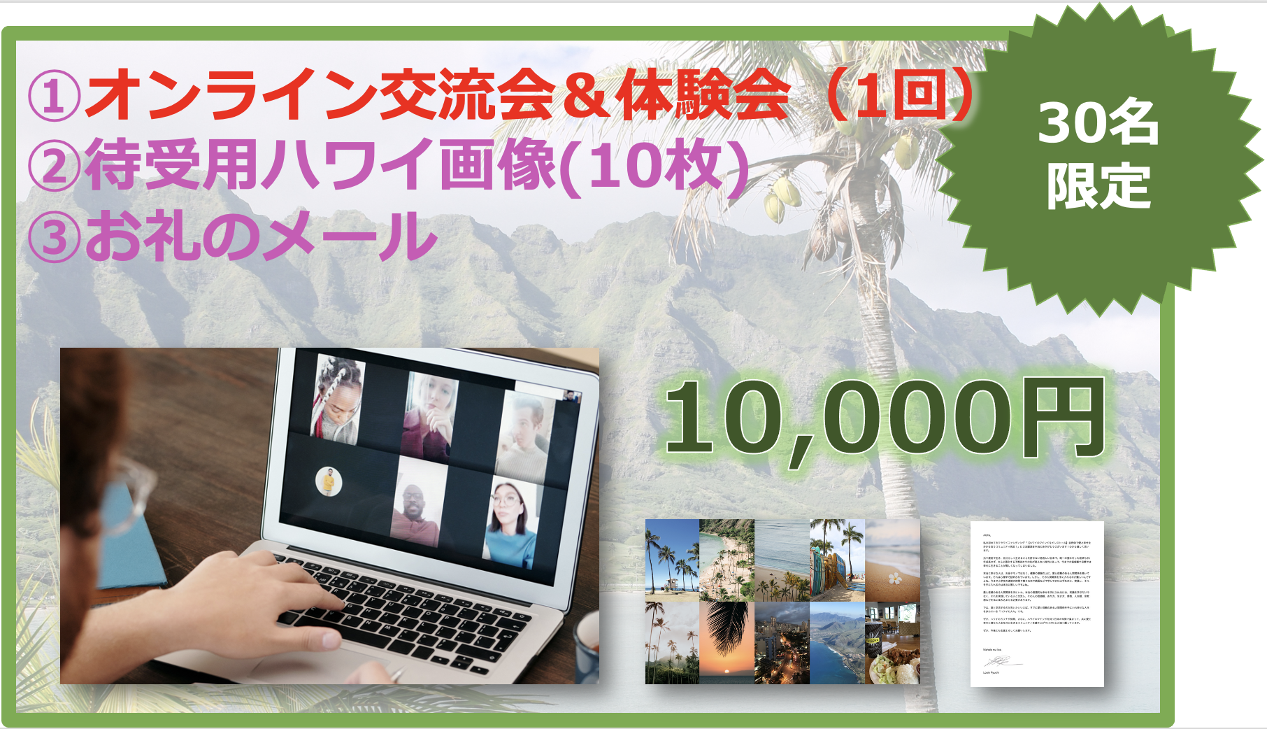 ハワイの叡智やマインドを共有し愛と幸せに満ちた生き方を分かち合う仲間が、参加した、きっかけを教えてくれました。その言葉の一部をまとめると・・・⚫︎ルイさんがハワイの体験で大きく人生が変わっている⚫︎カフナの在り方に触れる機会がある⚫︎とても安心して万全な環境で学べる⚫︎ギバーだけのグループを探していて実体験してみたいと思った⚫︎数字や売上ばかり強調しそうな男性の経営コンサルタントが、「愛と幸せを手にするからこそ成功する」と反対のことを言っているのが印象に残ったし、勇気づけらた⚫︎愛と幸せをふわふわ話すのではなく、ちゃんと理論的に語られているので、腹落ちし納得でき、安心した⚫︎結果を出さないといけないと苦しくなったことがあるが、自然体で満たされて幸せになってかつ成功もできることがすごくよく分かって人生に希望が持てた⚫︎ハワイの価値観・考え方・アロハスピリットを学べる⚫︎自分自身も大切にしたいと思っている価値観を共感できるコミュニティ⚫︎好きなハワイの歴史や文化が学べる何かピンときたら、ぜひ、参加・応援してください!
