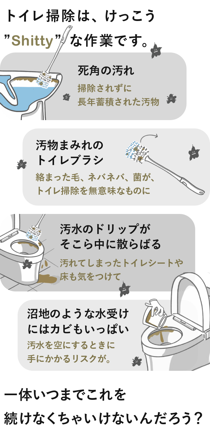 トイレが非衛生的なのは、主にトイレブラシのせいです。今までのトイレブラシは、たくさんの水をひっかけて、そこら中に水をおとし、ホルダーには余分な水がたまり、カビや細菌の温床になってしまっている。当然、そこにトイレブラシをつけておけば、ブラシ自体が汚れの源になってしまい、トイレクリーニング自体が意味のないものになってしまう。終いには捨てて、新しいものを買わざるを得ない。この嫌なサイクルはずっと終わらないのです。