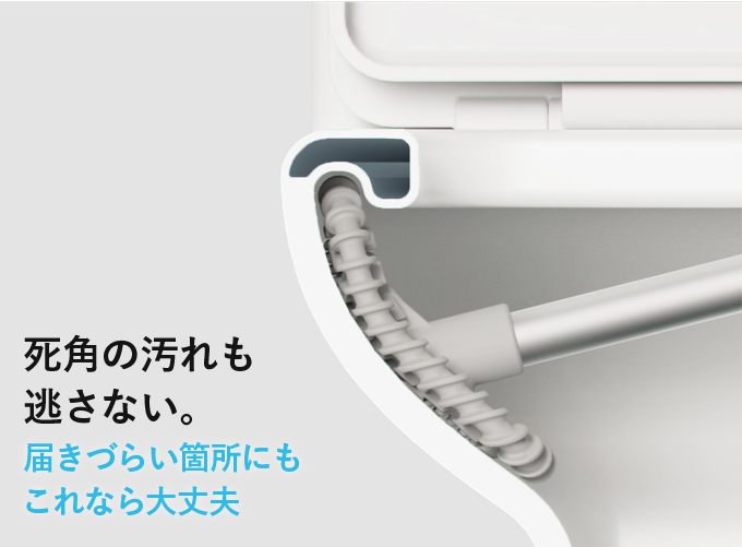 ブラシは50°近くまで曲がり、トイレの隅にも柔軟にフィットして、その隅に隠れていたベトベトも成敗します。本品の特殊シリコンは高い柔軟性を持つだけでなく、引裂耐性強度も十分にあり、高い耐久性をも誇ります。