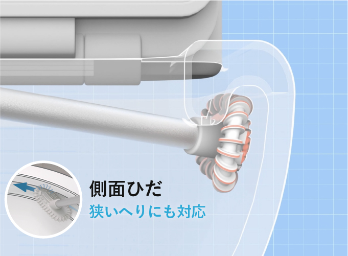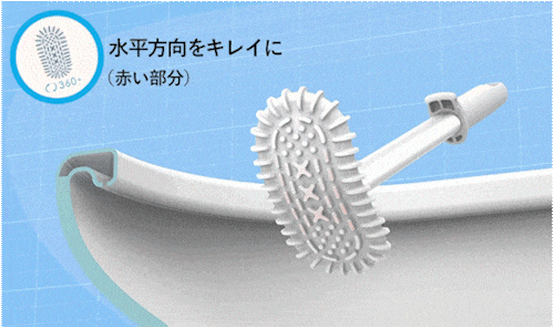 この特殊“ひだ”に究極の清潔さを実現しうる秘密アリ。窓ふきワイパーのようなひだが360°異なる方向を向いて全配置されており、簡単かつ強力に汚れをこそぎ落します。