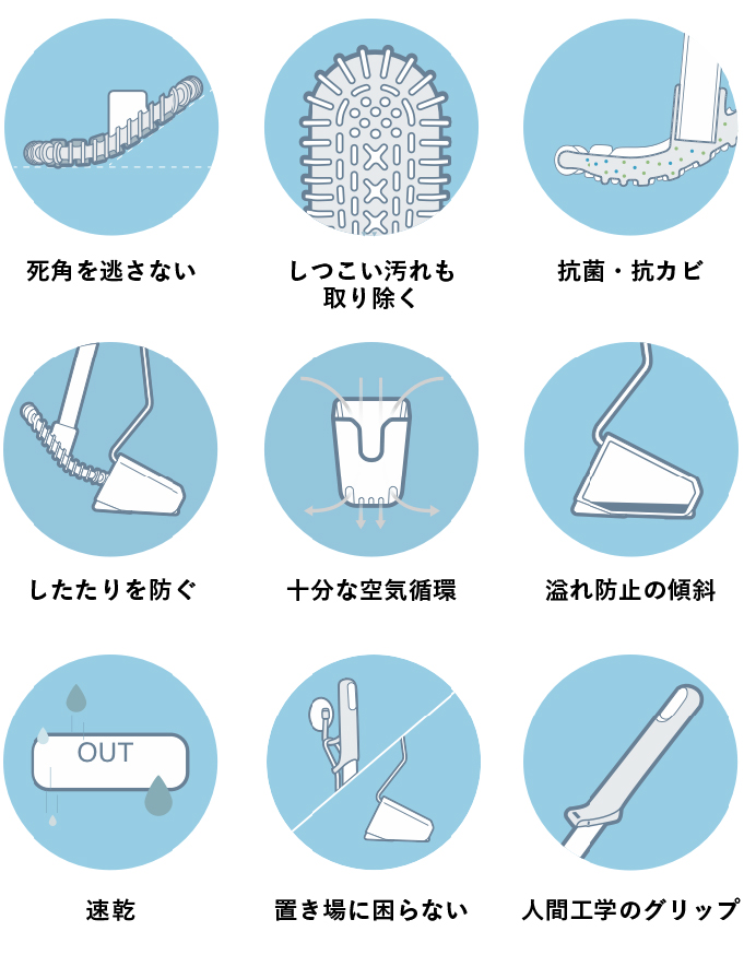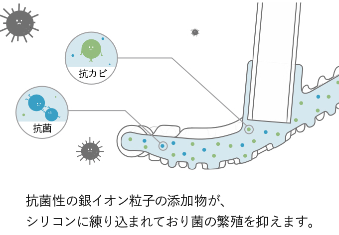 トイレは湿気が高いため、ブラシを清潔かつ乾燥状態に保ちにくい環境下であり、カビの発生や菌の増殖が起きやすくなります。ブラシ自体を衛生的に保つために、抗菌性のAg+銀イオン粒子をシリコン材質に添加しています。これによって湿度の高い状態でも、菌やカビの増殖を抑制することができます。