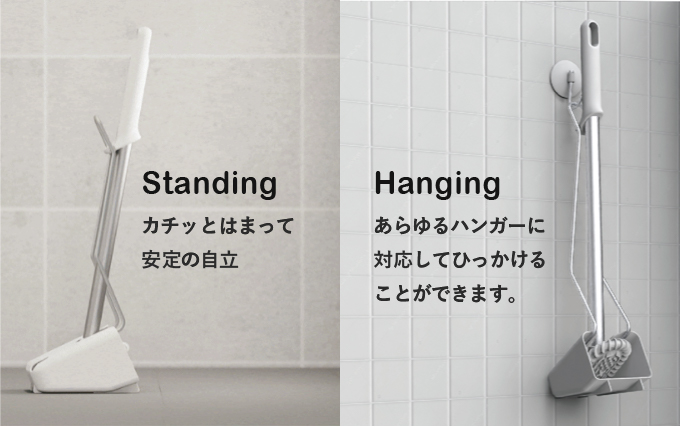 トイレをきれいですっきりとした空間にしたいものです。掃除道具のつまった物置部屋のようだと落ち着かないですよね。HUROYAMA Brushはいつでも便利でスマートであることを目指してデザインされています。壁につるしても、そのまま立たせても、ぐらぐらしたり外れたりすることなく、抜群の安定感で収納されます。