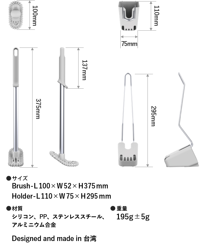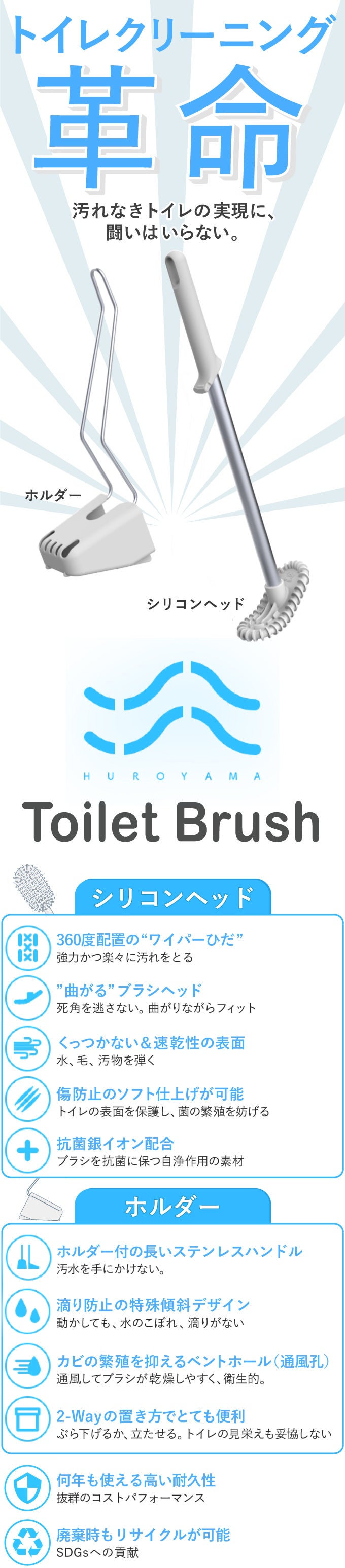 HUROYAMAのトイレブラシは、「シリコンのブラシヘッド」と「ホルダー」で構成されています。