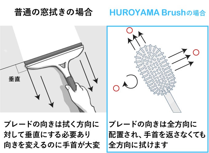 一方、HUROYAMA Brushのワイパーひだなら、多くのブレードが異なる方角を向いて全方位配置されているので、腕や手首を2秒ごとに捻じる必要もなく楽にクリーニングできます。