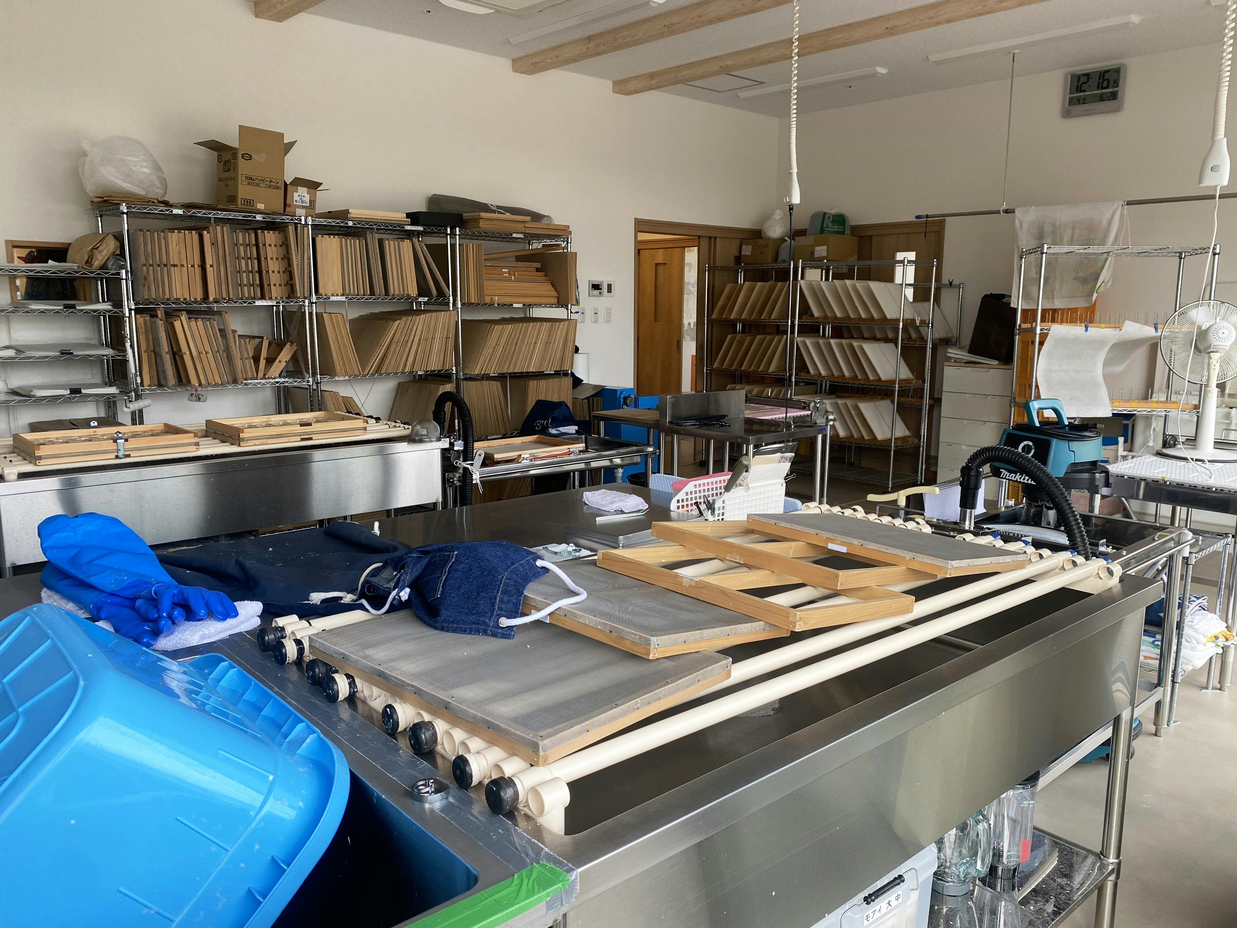 店長は紙にもものすごいこだわりが有り、コーヒーのデガラシを染料に使った手漉きの再生紙やバナナの皮で作ったバナナペーパーなども利用しています。写真は南三陸「Open Factory」に参加されたときの紙漉き場の様子です。