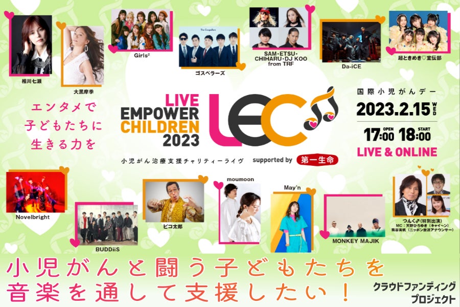 本プロジェクトへのご支援、誠にありがとうございます。沢山の方からご支援をいただきましたおかげで、目標金額100万円を達成し、現在目標達成率116%まで到達することができました。本プロジェクトでは「小児がん闘病中のお子様や、そのご家族へのご支援」を募っておりますが、具体的にどのような支援につながるのか、ご支援金の充当先でもある小児がん支援団体の活動と合わせてご紹介させていただきます。本日は、プロジェクトの中でも応援メッセージを掲載させていただいている、「医療の届かないところに医療を届ける」を理念に、小児がんと向き合う子どもたちの応援団としても活動している認定NPO法人ジャパンハート、そして小児がんの子どもたちが安心して笑顔で生活できる社会の創造に向けて日々活動を続けている認定NPO法人 ゴールドリボン・ネットワークの2つの団体をご紹介させていただきます。■認定NPO法人ジャパンハート認定NPO法人ジャパンハート リンクはこちら活動目的「医療の届かないところに医療を届ける」を理念に、 国、地域、人種、政治、宗教、境遇を問わず、すべての人が平等に医療を受けることができ、”生まれてきて良かった”と思える社会の実現を目指し活動しています。寄付金の活用途上国で小児がんをはじめとする病気と闘う子どもへの無償治療、日本国内で小児がんの子どもとご家族の夢を叶える活動を医療者がサポートする「SmileSmilePROJECT」など、団体が取り組む医療支援活動に使わせていただきます。支援者へのメッセージ今この瞬間も世界のどこかで、生まれてきた国の違いで医療格差に苦しむ病気の子どもたちが大勢います。彼らを一人でも多く救うために、皆様からのご支援を何卒宜しくお願いいたします。LECへのコメント今年から初めて参加させていただきます。このような素敵なイベントに携わることができ大変光栄です!また、小児がん事業に取り組む団体として、まだまだ認知度の低い小児がんに注目いただける機会を設けてくださっていることに感謝申し上げます。このイベントを通して、たくさんの小児がんのお子様とご家族、そしてご参加の皆様が最高の時間を過ごせますように…!■認定NPO法人 ゴールドリボン・ネットワーク認定NPO法人 ゴールドリボン・ネットワーク リンクはこちら活動目的小児がんの子どもたちが安心して笑顔で生活できる社会を目指し、以下の3つの活動方針を柱に小児がんの患児・経験者とその家族を、治療から就学・就労までサポートする活動を行なっています。①小児がん患児・経験者のQOL(生活の質)向上のための支援②「小児がんの治癒率向上」および「小児がん経験者の生活の質の向上」のための研究助成③小児がんの情報提供と理解促進寄付金の活用小児がんの子どもたちとその家族を取り巻く問題(経済的負担、情報収集の困難さ、周囲の理解不足等)の解決のために、先述の3つの活動方針に基づく支援事業に大切に使わせていただきます。「交通費等補助金制度」では適切な治療を受けるため遠方の病院での入院治療が必要な場合にかかる交通費や付添い家族の宿泊費の助成をしています。また、「ゴールドリボン奨学金」は、経済的に困難な状況の小児がん経験者の大学等進学を支援する予約採用型(入試前に採用を予約し、合格後に奨学生として決定)および給付型(返還不要)の奨学金です。その他、小児がん治療のために入院する子を持つひとり親世帯への入院時の支援金支給、小児がん治癒率向上のための研究助成、ニット帽子・マスクのプレゼント、就労移行支援、小児がん情報提供、啓発活動などを行っています。支援者へのメッセージ小児がんの子どもたち・経験者の子どもたちへの温かいご支援をありがとうございます。皆さまのお気持ちは子どもたちのちからになります。いただいたご寄付は、子どもたちとそのご家族がより安心して生活するための事業に大切に反映させていただきます。LECへのコメントアーティストのみなさま、会場のみなさまからの歌や温かいメッセージからパワーをいただいています。今回は会場とオンラインのハイブリッド開催ということで、小児がんの子どもたちや経験者、そのご家族と一緒に当日を楽しみにしています!ご支援先の団体は以上です。皆様からいただいたご支援金は全額を、ライブの収益や、その他の寄付金とあわせて、以上の10団体様へのご支援金に充当させていただきます。本プロジェクトは明日が最終日です。残り2日間、皆様からの温かいご支援、引き続き、どうぞよろしくお願いいたします!