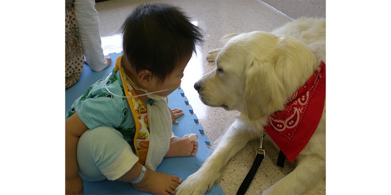 ①ファシリティドッグ:専門的に訓練を受けた犬が看護師資格のあるハンドラーと共に医療スタッフの一員として病院に常勤し子どもたちに寄り添う動物介在療法