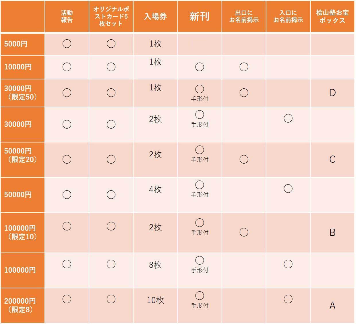 ③30000円(限定50個)桧山塾のお宝ボックスD(中身は別記)、桧山タミ新刊(2023年5月発売予定)手形付き、展覧会出口にお名前を掲示、入場券1枚、オリジナルポストカード5枚セット、 月に一度の活動報告メール