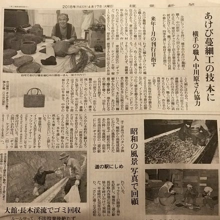 読売新聞秋田県版 4月17日付けの朝刊に掲載していただきました。 記者の方が中川原さんのところにも足を運んでくださり 生の声を記事にしてくださいました。 記者の方は以前、掛け唄の大会の取材をされたことがあったそうで あけび籠より、むしろ掛け唄の中川原さんという認識だったようで すが、今回の取材で「とても素敵なご夫婦でした」との 感想を漏らされていました。 秋田の皆様にも知っていただけるいい機会になったと 思っております。ありがたい限りです。
