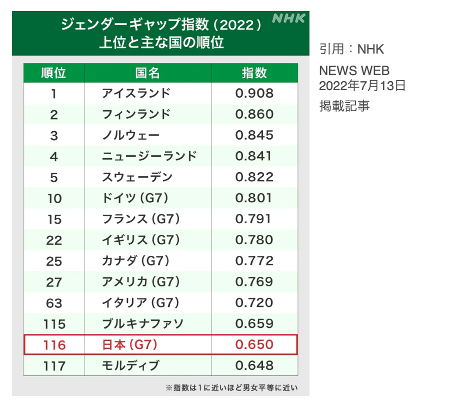 2022年7月に発表された「ジェンダーギャップ指数2022年」によると、