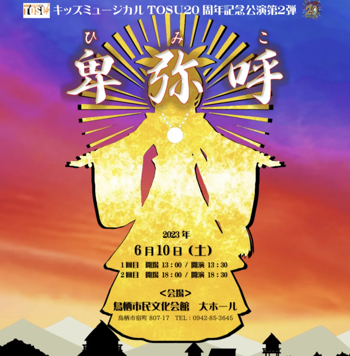 キッズミュージカルTOSUは、「ミュージカルという表現活動を通しての子どもの健全育成と地域からの質の高い文化の発信」を目的に活動し、20周年を迎えます。ミュージカルは、歌、ダンス、演技と、3つの要素を持つ難しいお芝居です。4人の専門の講師による真剣な指導により、子どもたちは、一生懸命に練習を重ね、毎年、公演を続けてきました。公演は素人とは思えないといわれるほど、レベルの高い公演です。卒業生の中からは、プロのミュージカル女優や宝塚女優として活躍する子もいます。これからも、この事業を続けていきたいと切に願っています。応援のほどよろしくお願いいたします。まずは、20周年記念公演【卑弥呼】を観て頂き本格的な公演を体感して頂きたいと願っております。