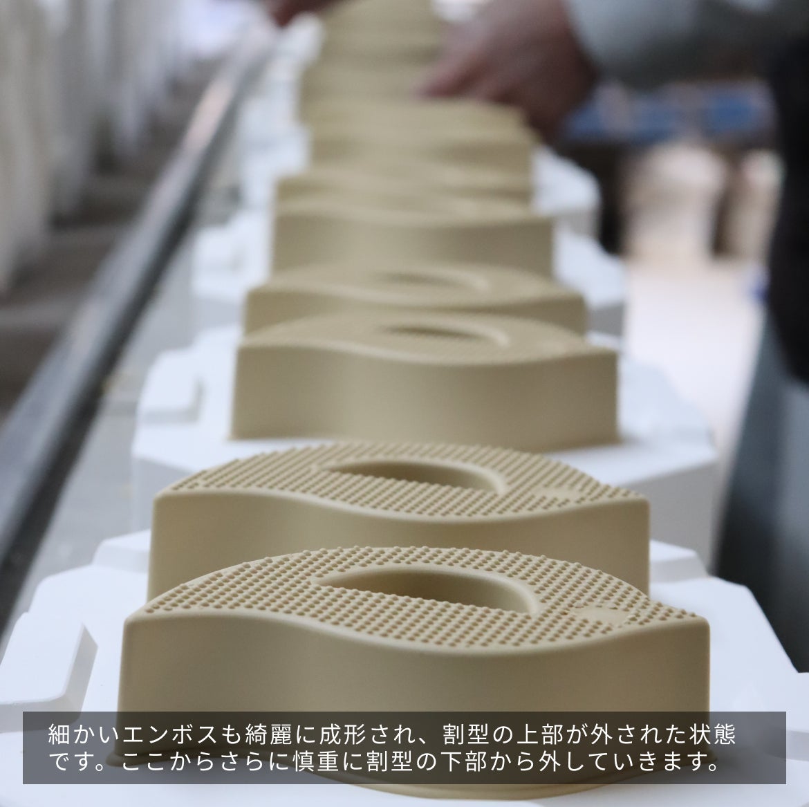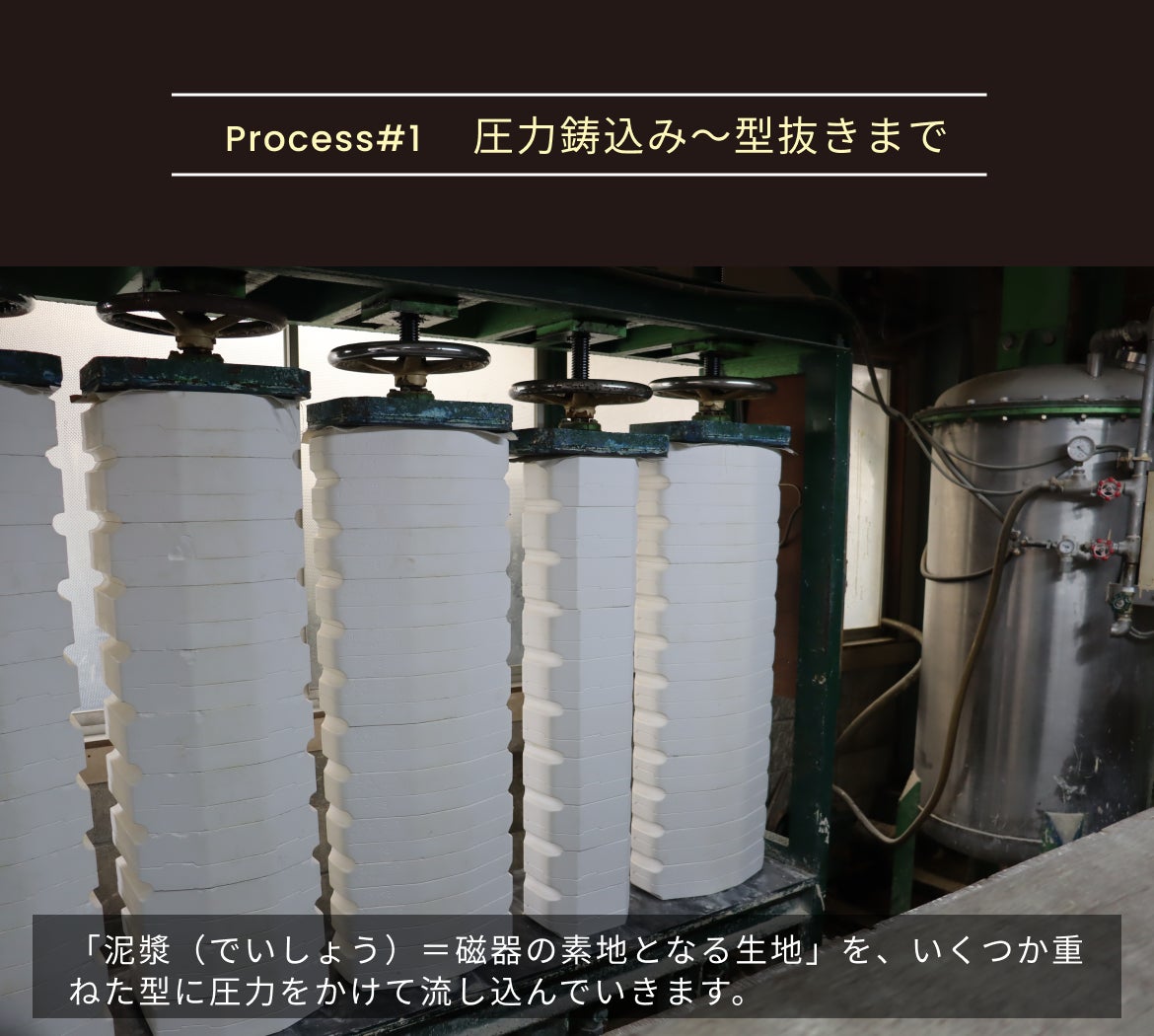 が、ヤマト陶磁器さんより「鋳型の形状の都合上、側面にエンボス加工はできない…」との連絡が。ならば型を4つ割にするか6つ割にするか等々、様々な検討の結果「転写技術を使いましょう」とのヤマト陶磁器さんからの提案。つまり、型の側面にエンボス加工を施すことは難しいが、「転写(側面にエンボスのシールのようなものを貼る加工)」ならイケるかも?とのことで、その方向でGo!そして最終試作品へ。