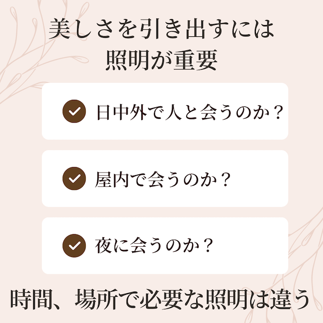 人と会う時間、場所によって自分の美しさというのは変わります。それは“照明”が異なるからです。日中、天気の良い日に外で人に会う時には、太陽光という照明によって私たちの肌は照らされています。また、夜の会食では、温かい照明の下で会食をしているでしょう。