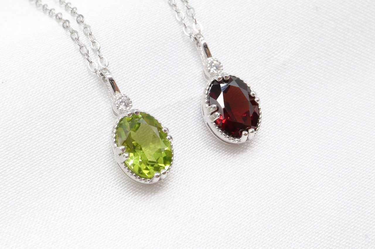 今回のプロジェクトでは、魅力的な2つの天然石を使用し、オシャレなデザインネックレスを制作いたしました。「ペリドット」「ガーネット」の魅力を最大限に引き出すため、上質なカットに仕上げております。