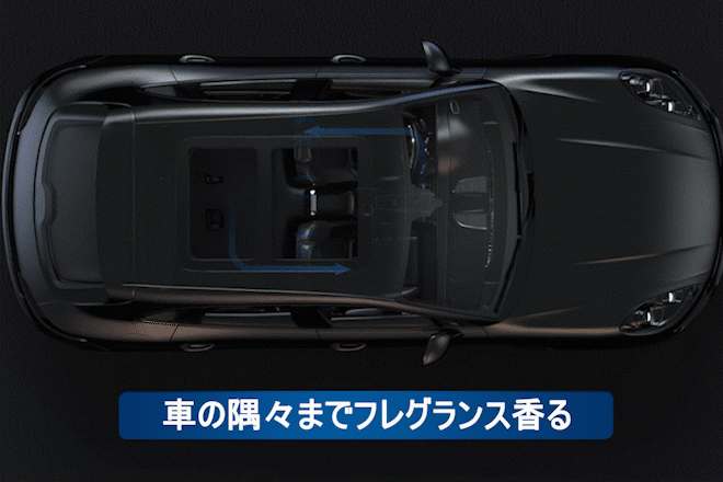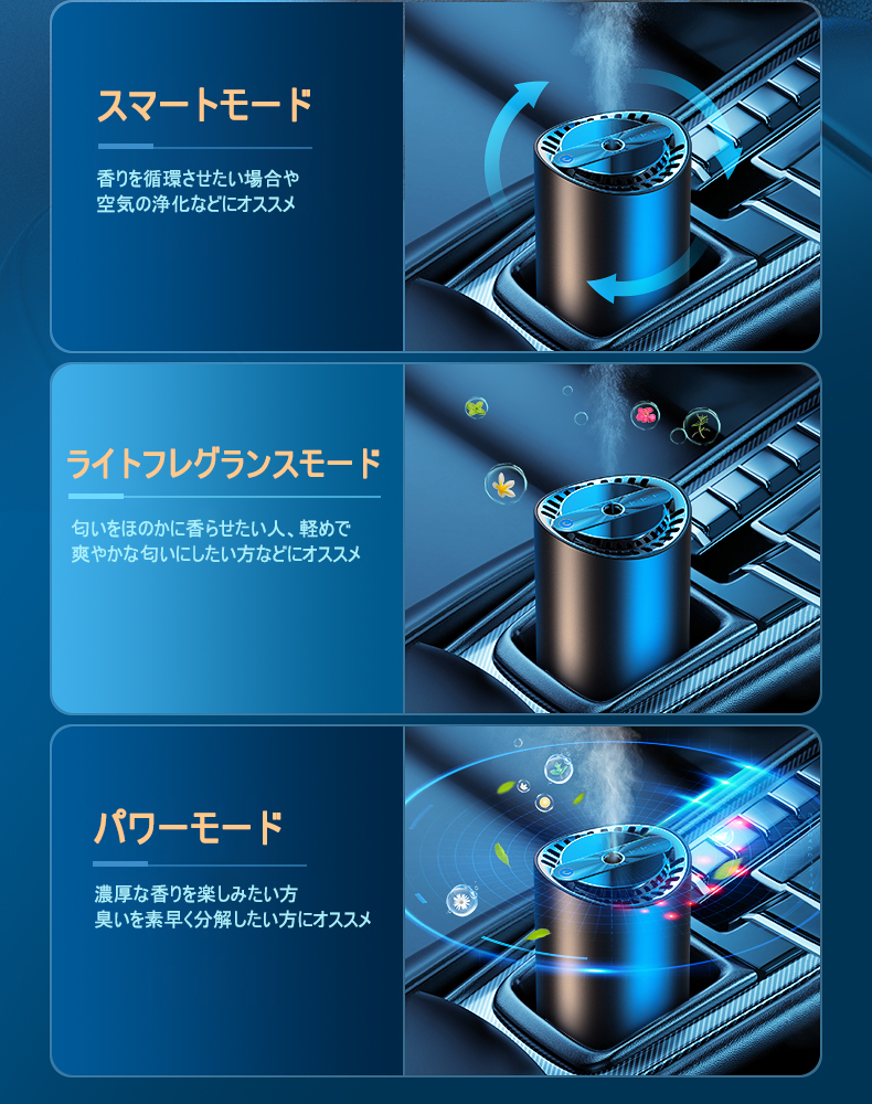 A: AI技術を使用したスマートな空気清浄・ディフューザーです。セットしたお好きな香りのフレグランス剤を噴射し、車内に心地よい香りを広げます。