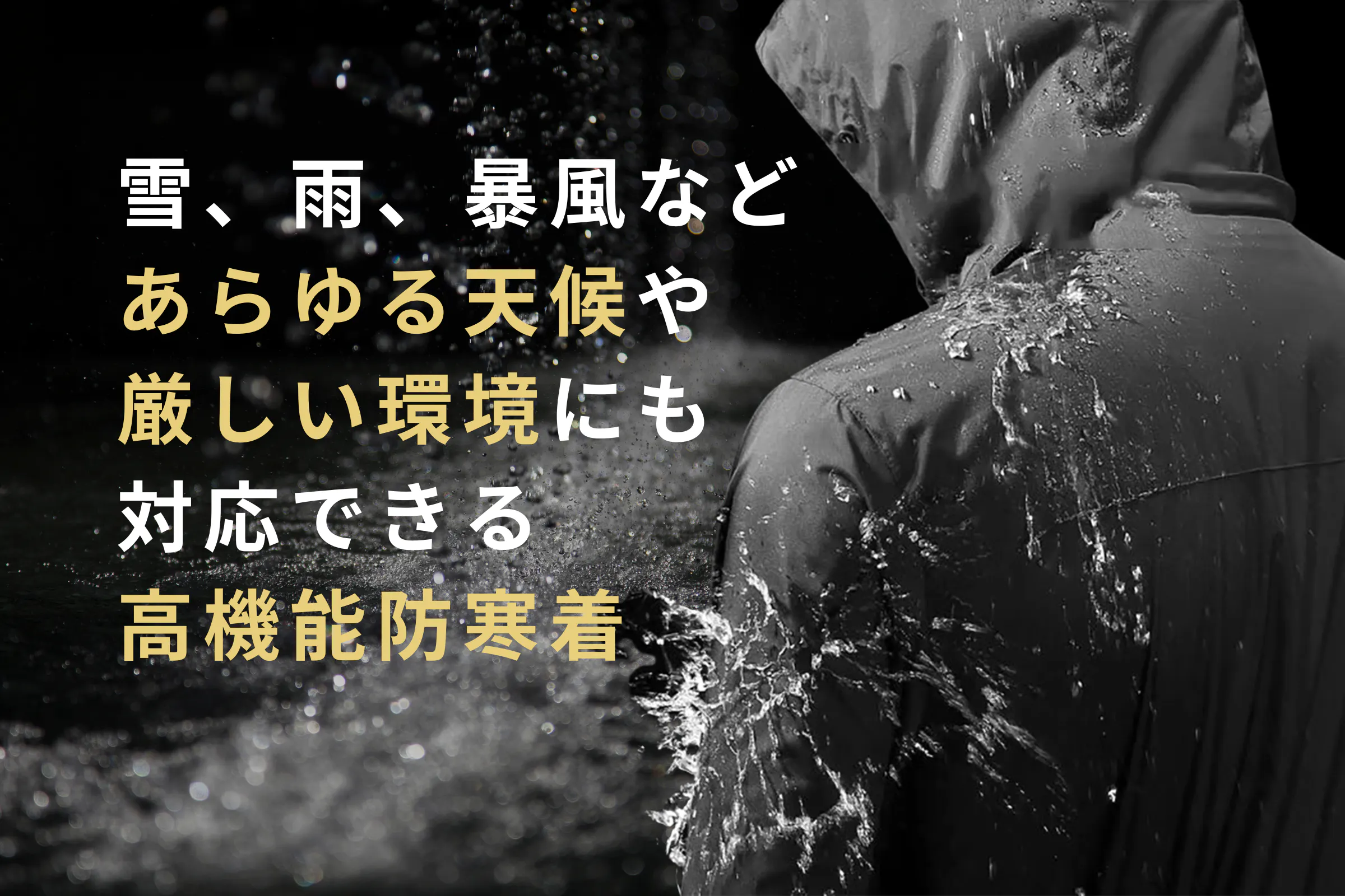 「高機能性防寒ジャケット」は、断熱性だけでなく撥水性、防風性、防汚に優れた素材を使用しており、雪や雨、暴風などの悪天候に対応できる、高機能な防寒服です。