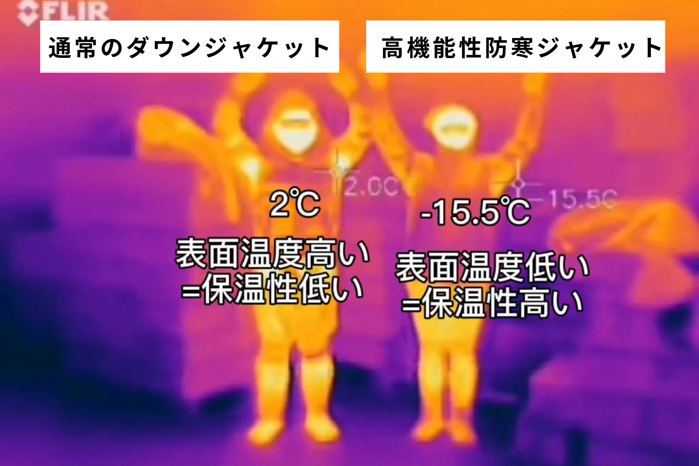 2つを比較してみると、エアジャケットシリーズ(写真右)の保温性が格段に高いことがわかります。一方、通常のダウンジャケット(写真左)は熱が外に逃げてしまっています。