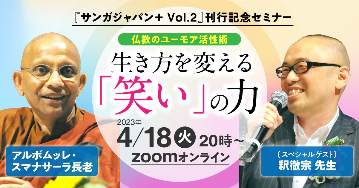 さて明日、4月18日(火)20時より、アルボムッレ・スマナサーラ長老と釈徹宗先生のオンライン対談「仏教のユーモア活性術ー生き方を変える「笑い」の力」を開催します。