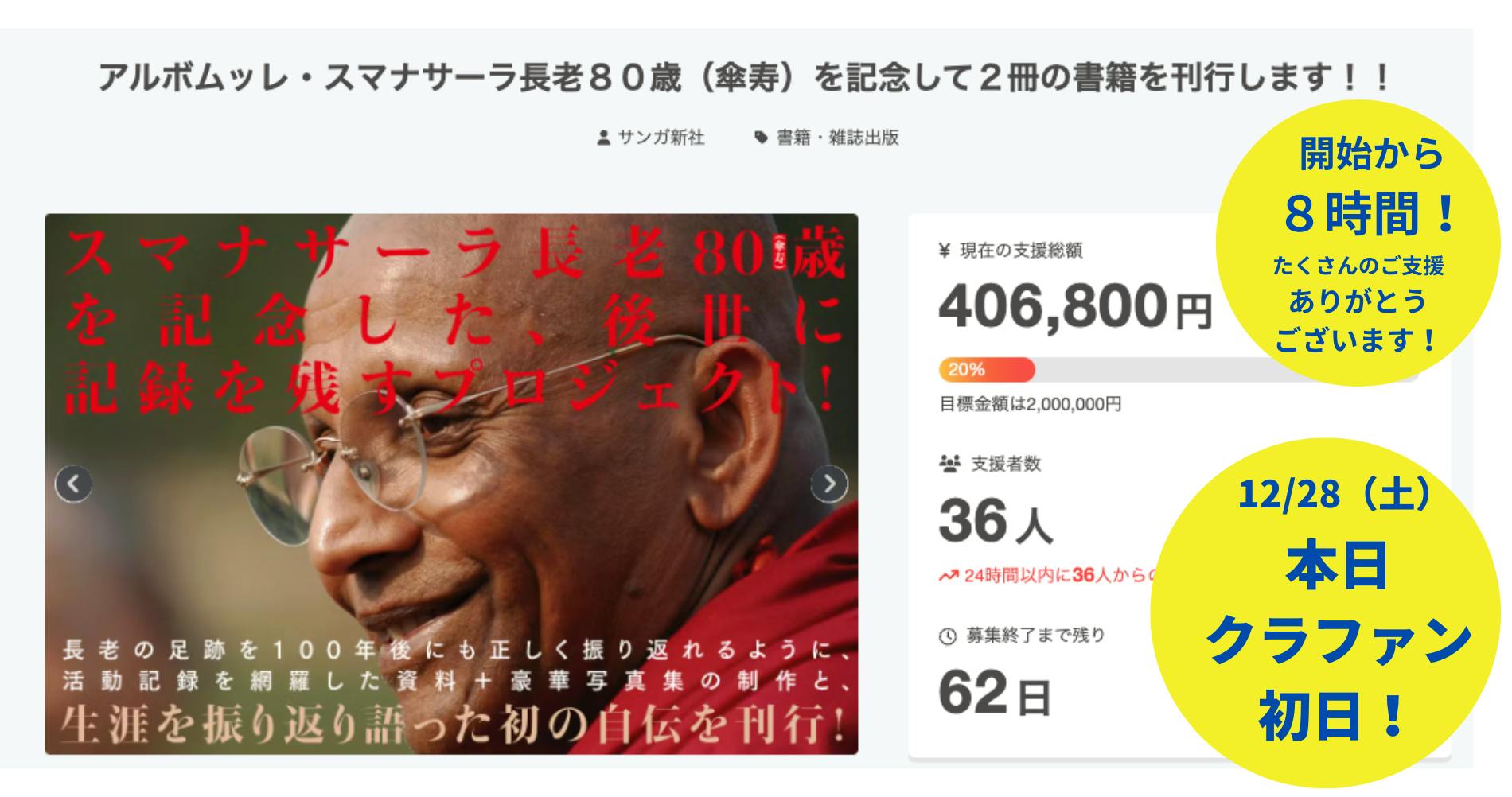 クラウドファンディング「アルボムッレ・スマナサーラ長老80歳(傘寿)を記念して2冊の書籍を刊行します!」を、12月28日(土)午前7時にスタートしました!