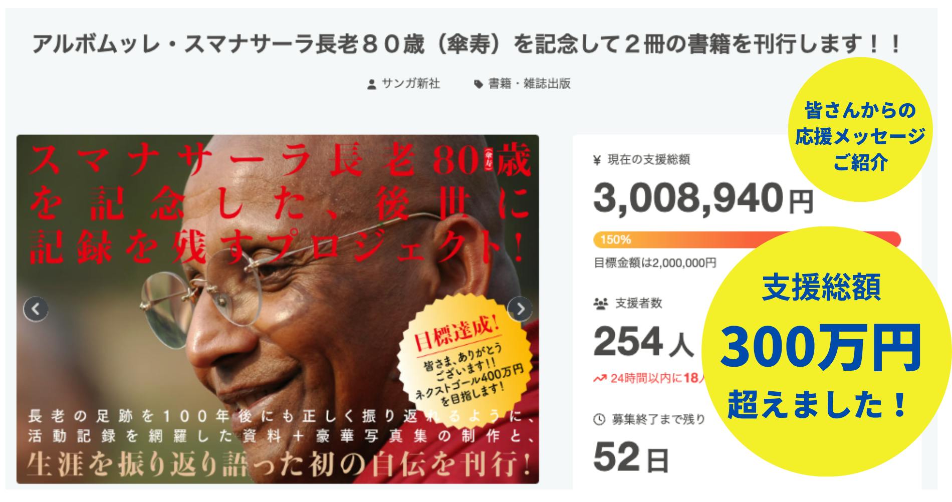 「アルボムッレ・スマナサーラ長老80歳(傘寿)を記念して2冊の書籍を刊行します!!」クラウドファンディングは、スタートから11日目となる本日1月7日(火)に支援総額が300万円を超えました!
