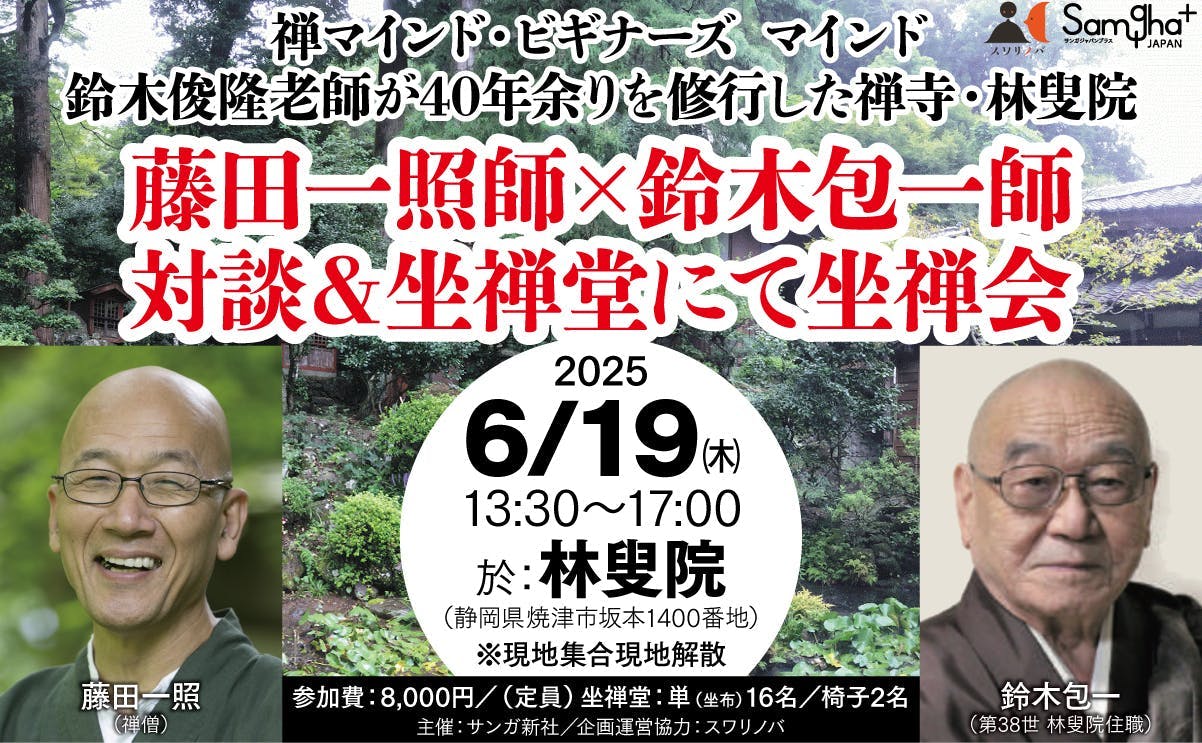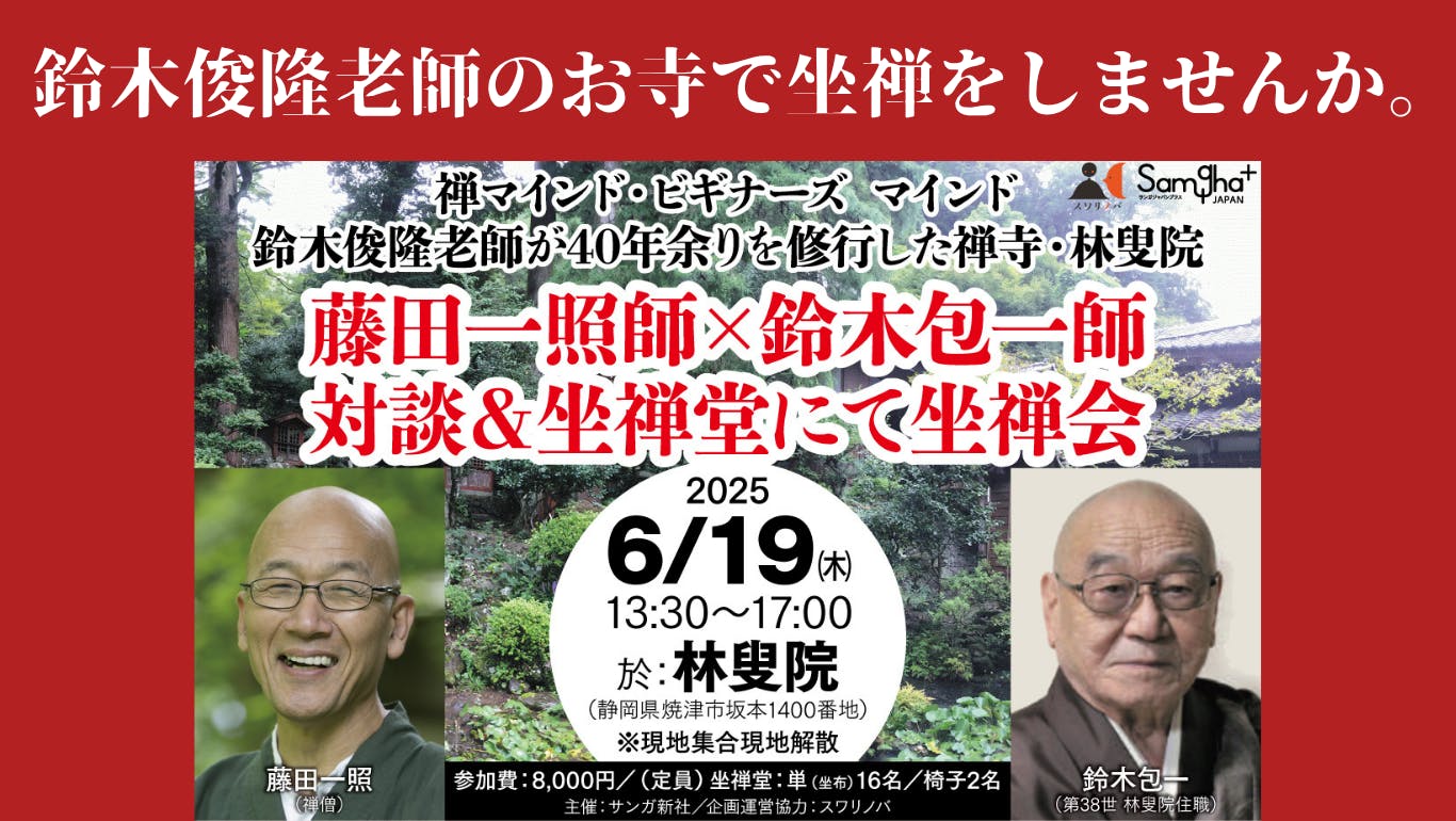 『禅マインド・ビギナーズ マインド』を新たに翻訳しPHPから刊行された藤田一照師をお相手に、書籍からはうかがい知れない、俊隆老師の姿をお聞きできる機会と思います。