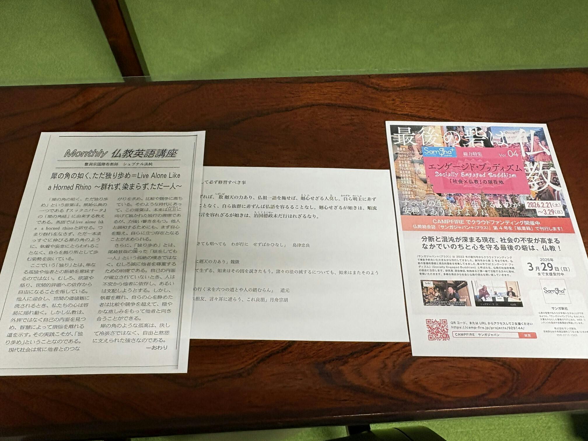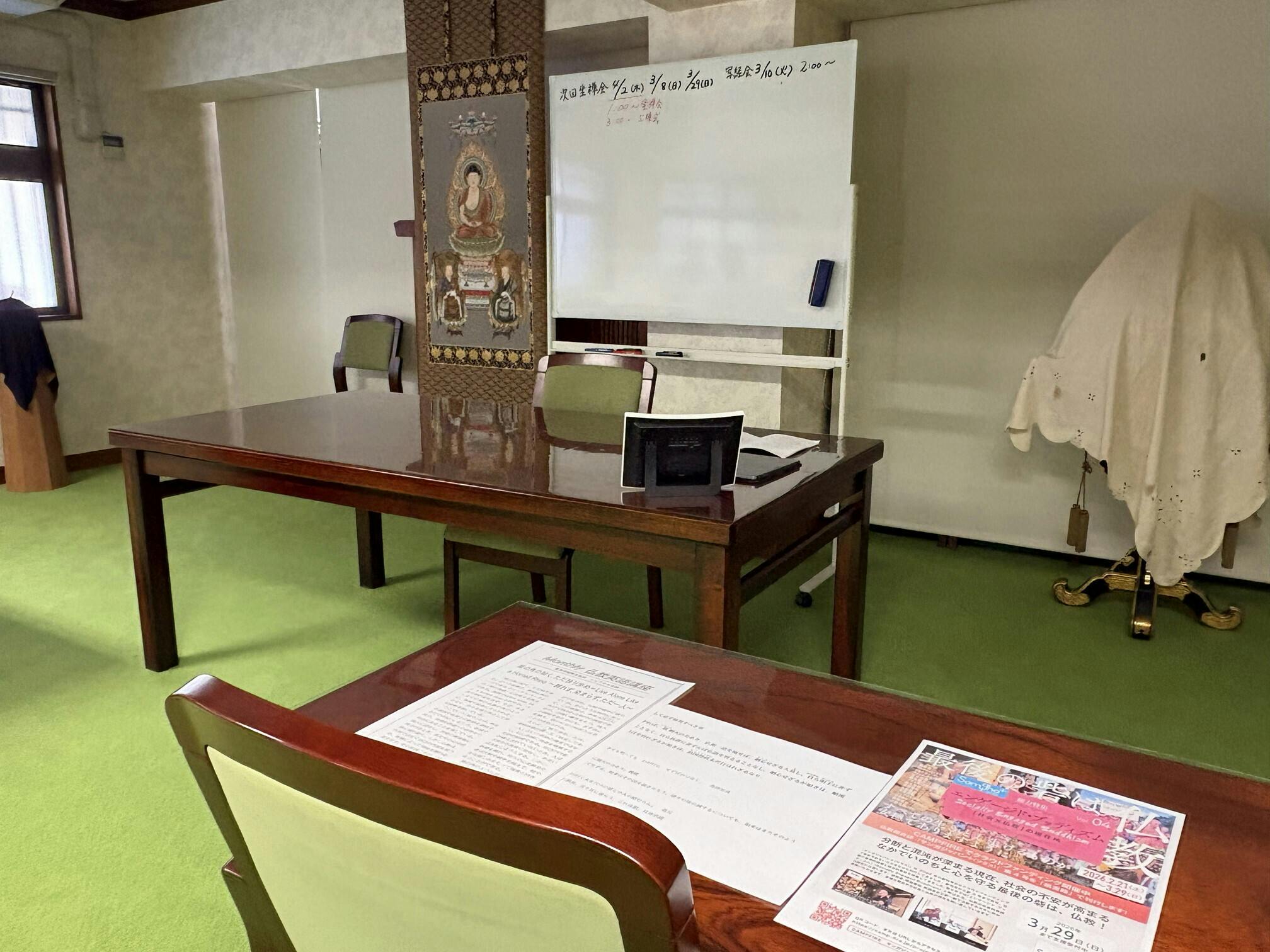 本堂での坐禅から移動して、法純師の提唱はテーブルと椅子のある部屋で行われました。その後、貴重なお時間をいただき、参加者の皆さまへクラウドファンディングのチラシの配布とご紹介をしました。その場でQRコードを使った申し込み方の質問をいただいたほか、ネット上の「WEB サンガジャパン」で公開していた対談の一部をすでに読んで関心を持ってくださっている方が何人もおられ、手応えを感じました。