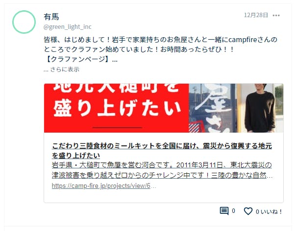 2023/02/06 18:57こんにちは、河合です。沢山のご支援をありがとうございます!!そして、家業持ちを支援するプラットフォーム「家業エイド」からも沢山ご支援をいただいております!本当にありがとうございます!!親父の代から自分の家が大槌町でお店をやっているのが当たり前で、これまでは自分が「家業持ち」だってことは全く意識せずに過ごしてきました。だけど今回プロジェクトを立ち上げるに当たって、たまたま家業エイドに出会って色々なことが変わりました。家業エイドで沢山のつながりと温かい応援をいただいて、実際にご支援をいただいて、、「家業持ち」である自分を再発見できたし、大槌町の外側に沢山の素敵な「家業持ち」の繋がりができました。世界が広がりました!出会いに感謝!御礼も兼ねて家業エイドの登録フォームを載せておくので、家業持ちや事業に興味のある方は登録してみてください!【家業エイド登録フォーム】(無料です! 安心をー)https://kagyoaid.com/プロジェクトも100%達成まであともう少し!僕も頑張りますので、皆様もよかったら助けていただけたら嬉しいです!よろしくお願いいたします。 もっと見る