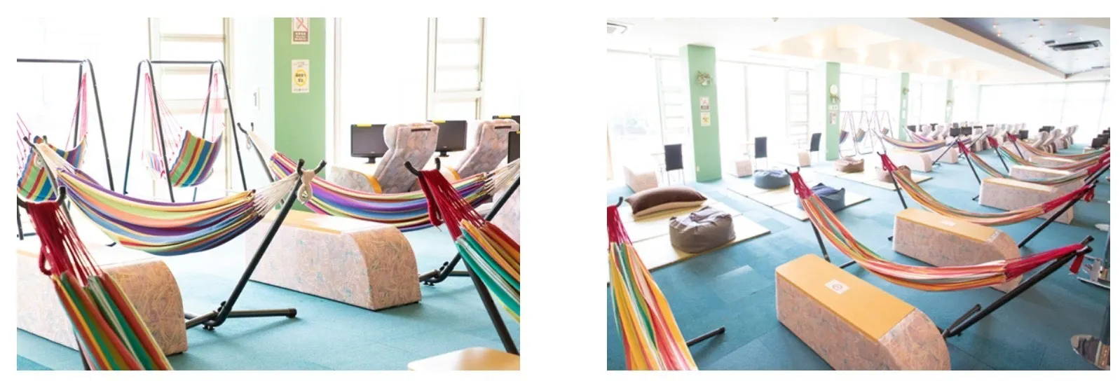 1階には家族で過ごせるリラックスルーム、2階にはここちよい疲れをゆっくりと癒す、やすらぎの空間を用意しています。温泉を楽しんだ後、専用テレビがついたリクライニングチェアやハンモックで過ごす至福の時間を、どうぞお楽しみください。