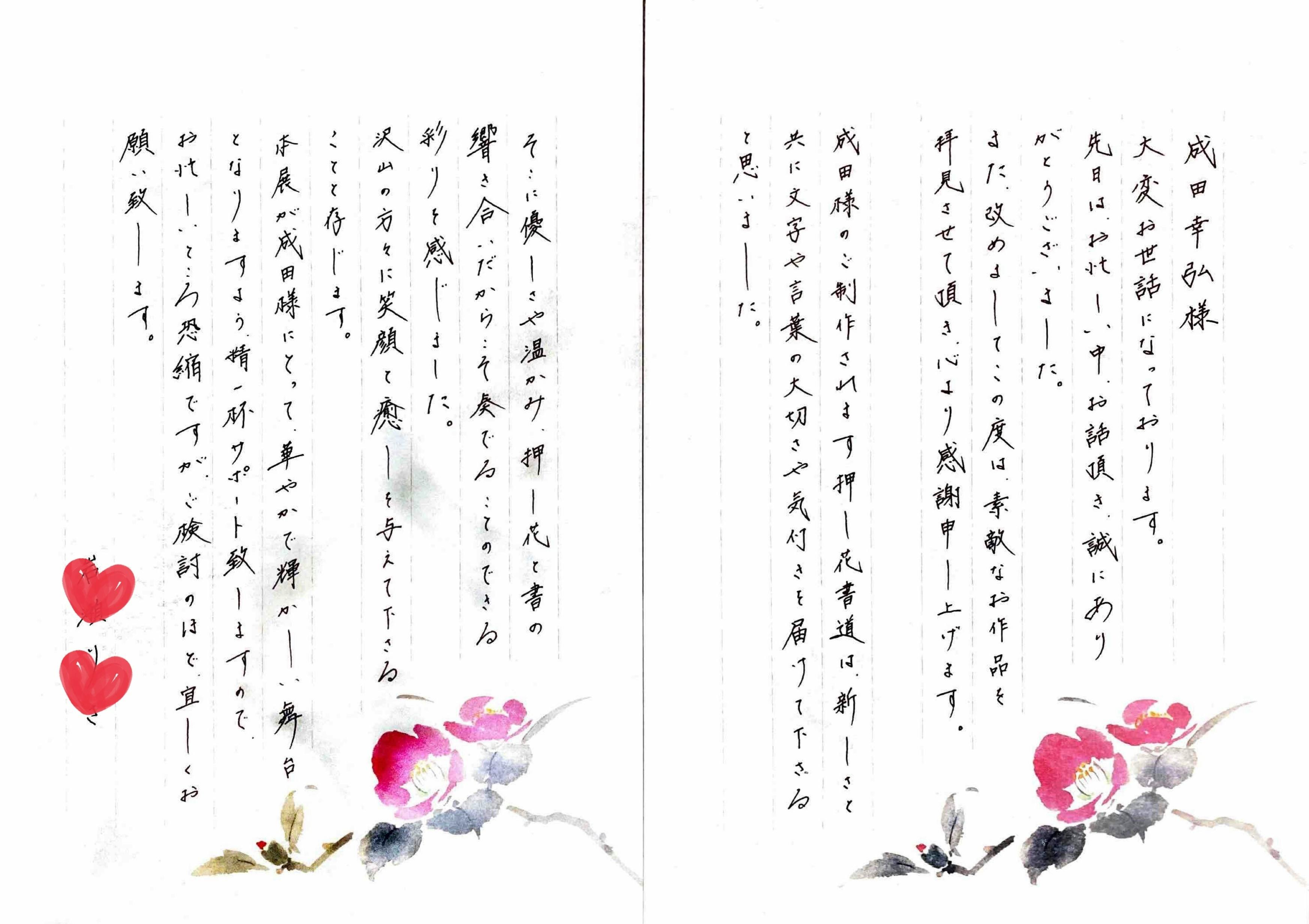 書道は固いイメージがあるけど、押し花書道のように柔らかくて親しみやすく観て下さった方々に「笑顔」と「癒し」を与えて下さる事に違いないと僕の背中を押してくれました。
