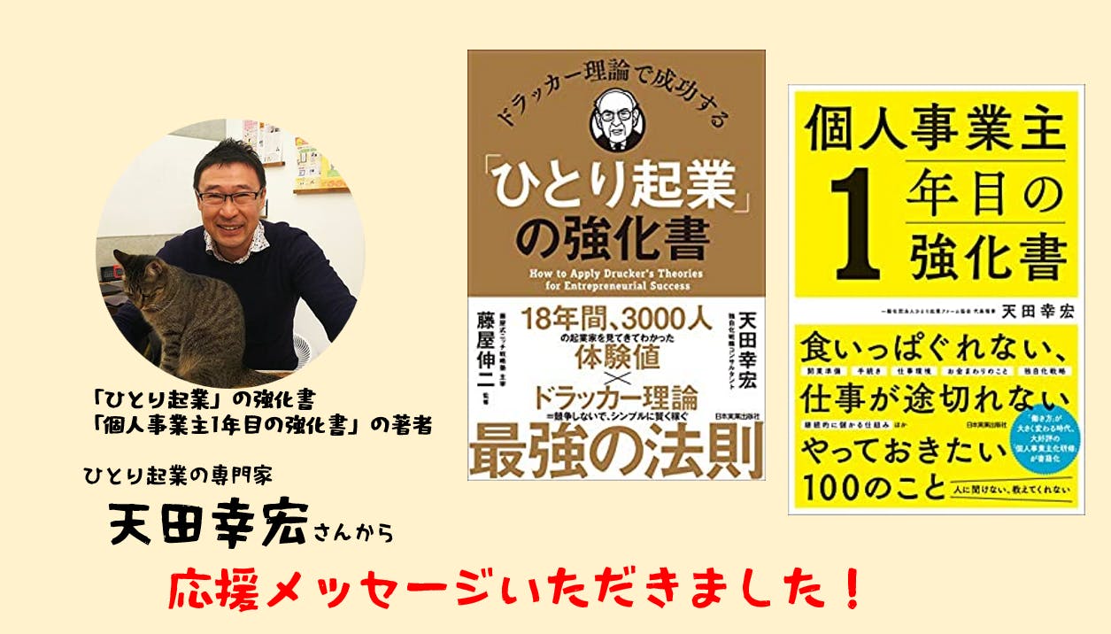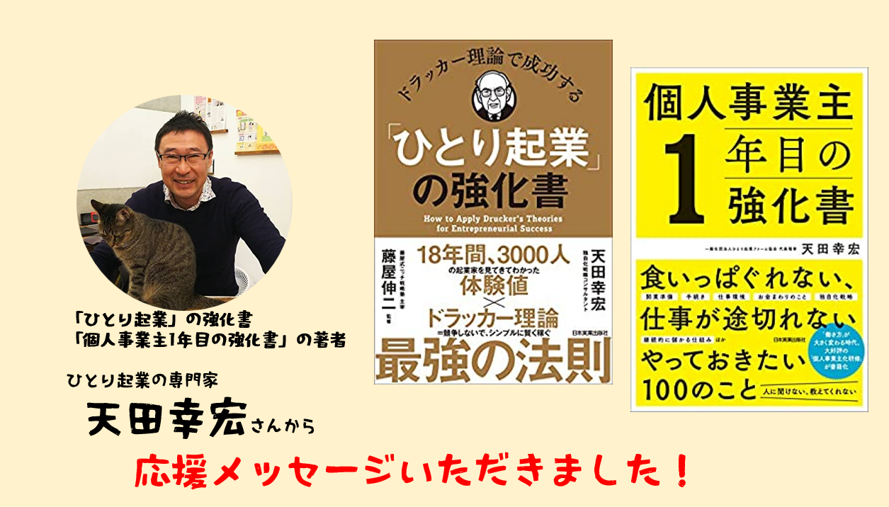 『ドラッカー理論で成功する「ひとり起業」の強化書』『個人事業主1年目の強化書』の著者でもある天田幸宏さんより応援メッセージをいただきました。