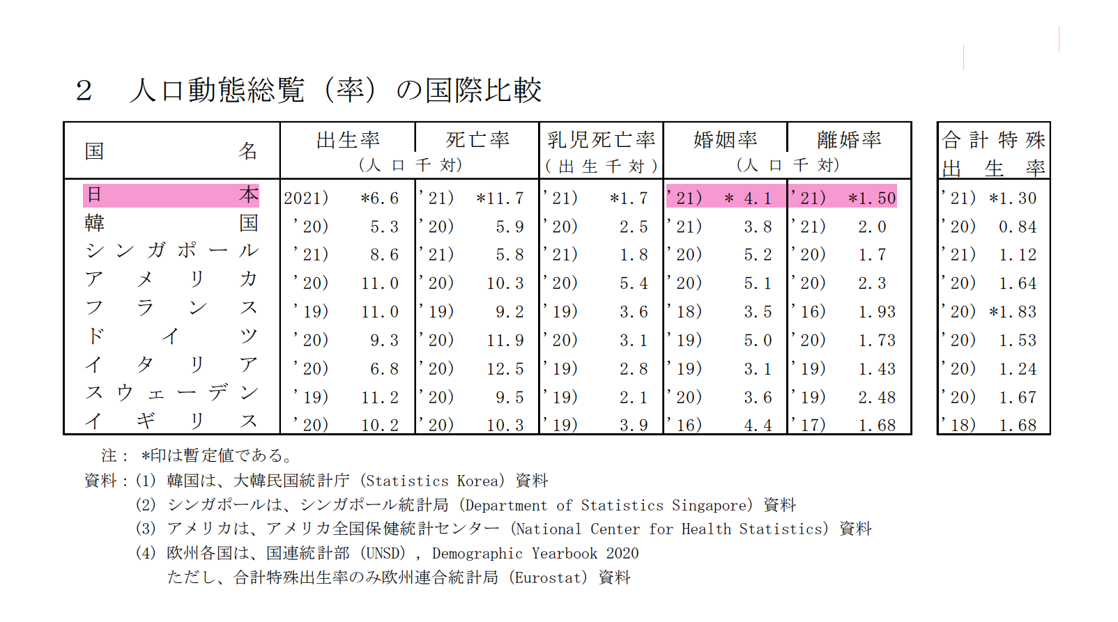 (「令和3年(2021) 人口動態統計月報年計(概数)の概況」の人口動態総覧(率)の国際比率より抜粋)