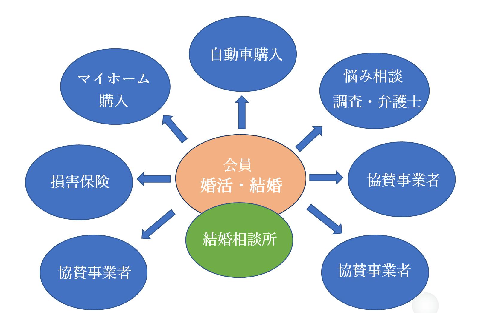 既に述べた通り、人生のゴールが結婚ではありせん。それは夫婦間の問題だけではなく、その後、様々な問題に直面する事があるからです。いうなれば、〝スタート〟なのです。問題に直面するだけではなく、結婚→出産→子の成長→引っ越し(マイホーム購入)→子の成長→相続問題などという一般的な生活(家族)設計が続いていく事と思います。また事業を起こせば法律問題、経営コンサル、資産の運用、という事もあります。そこで当方は、一過性の利益を求めるものではなく、協賛企業様を募る事で、可能な限り結婚後の生活もサポートしたいと考えたのが、この〝安心安全な結婚相談所〟プロジェクトの〝ミソ〟であります。