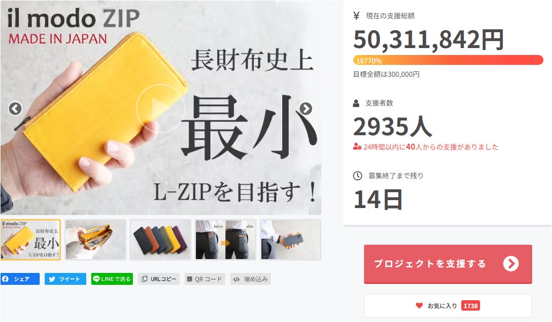 皆様からの温かいご支援のおかげで、最小を目指す長財布「il modo ZIP」の支援額が5000万円を達成することが出来ました!