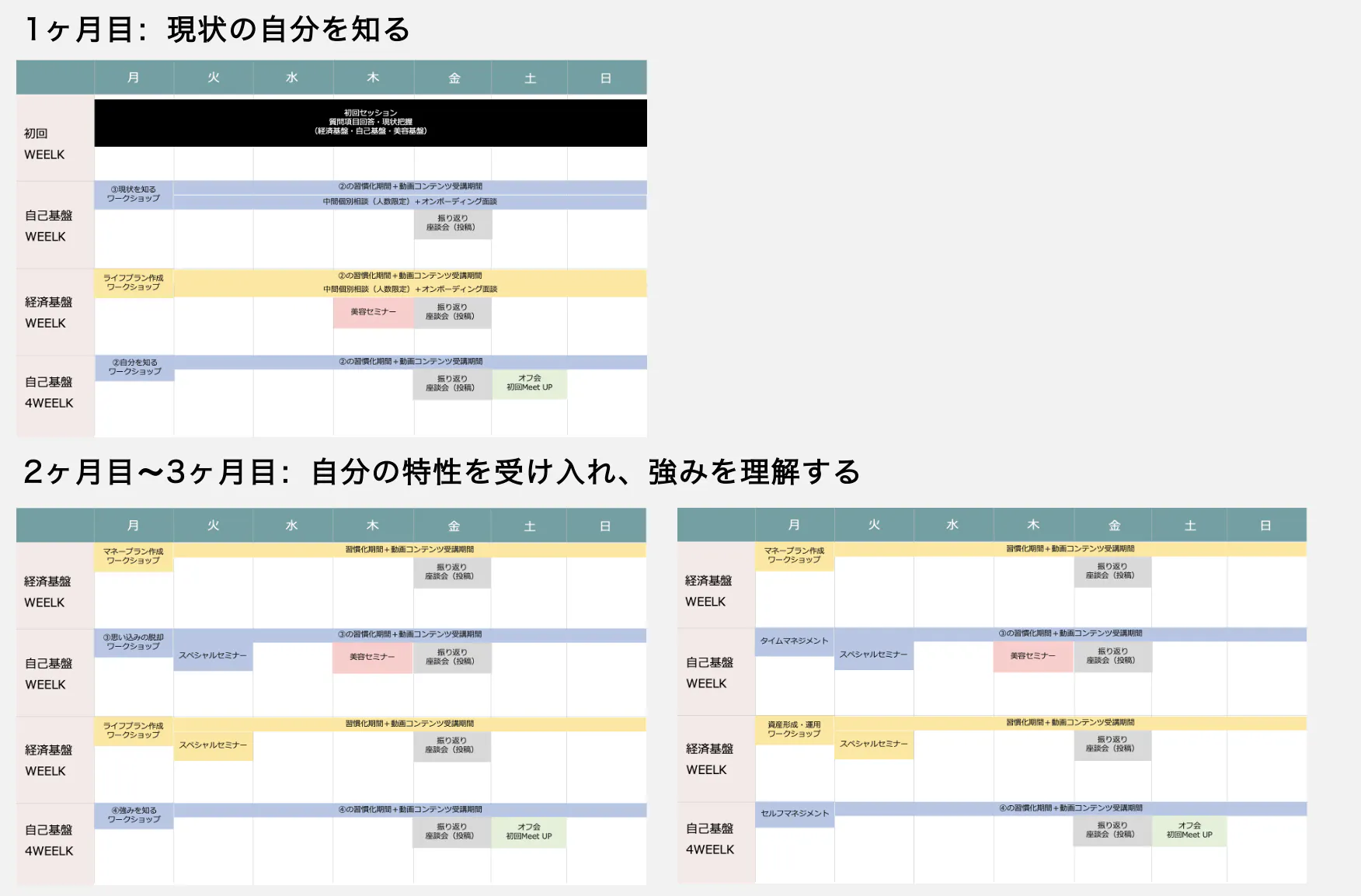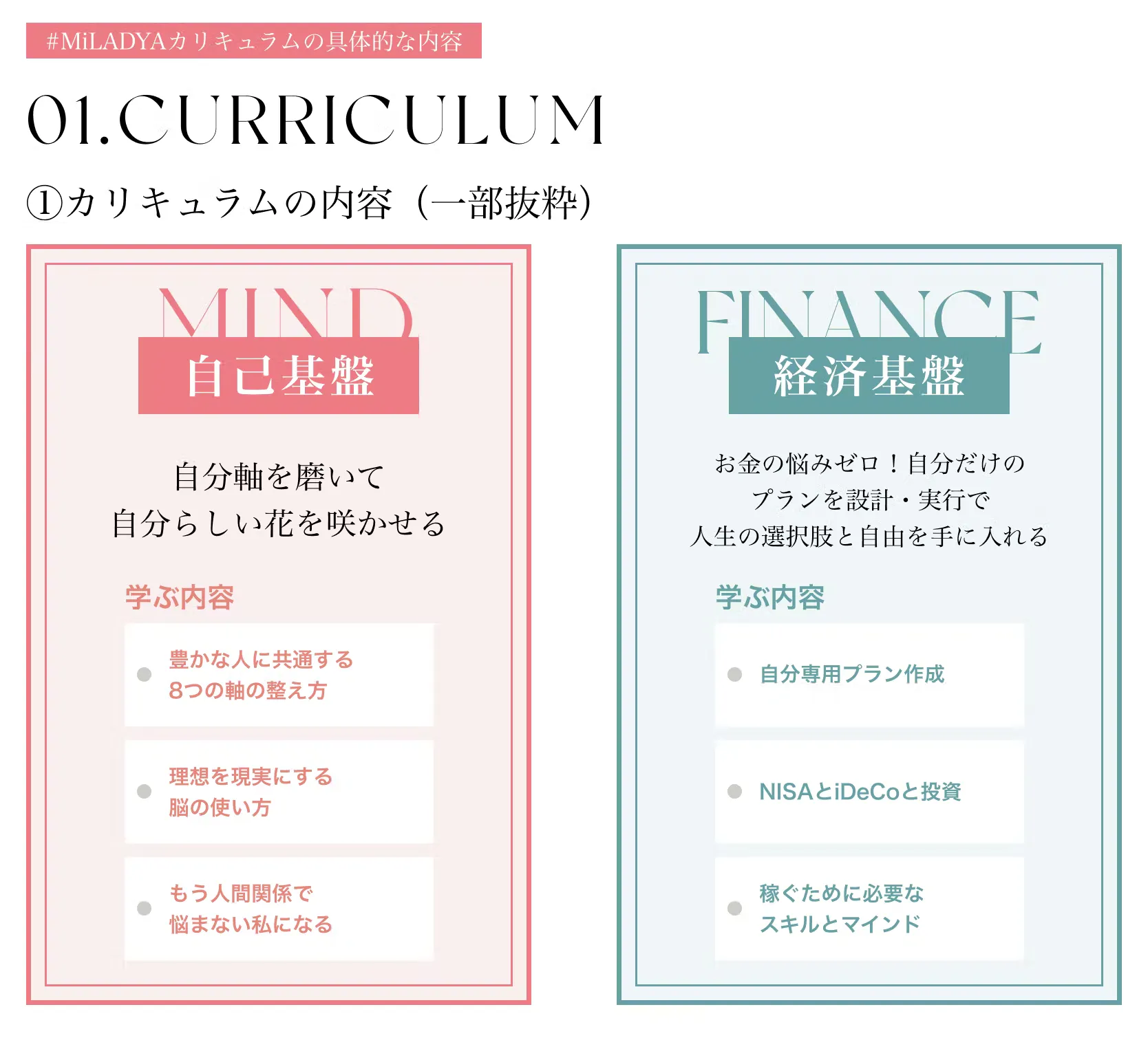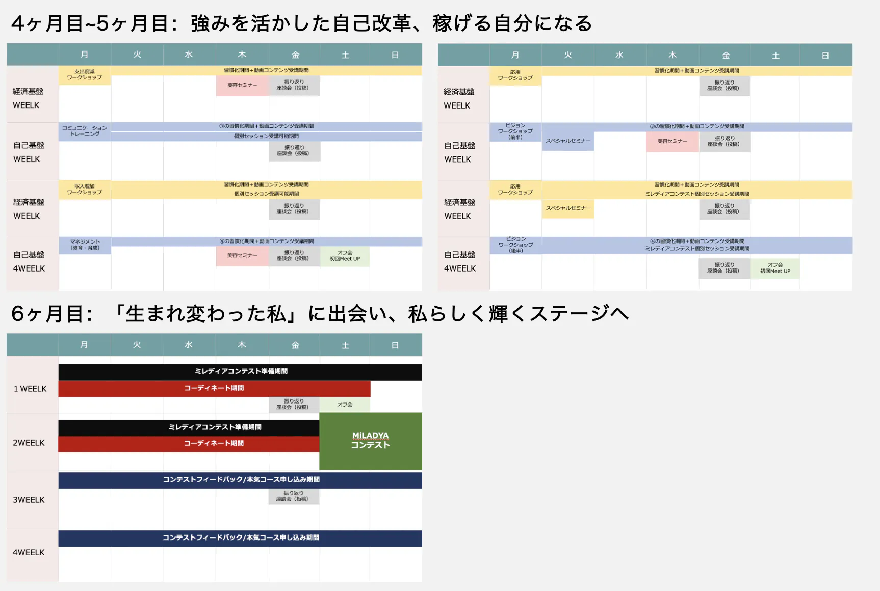 6ヶ月でMiLADYAが定義する3つの基盤(自己基盤/経済基盤/美容基盤)を整え、「自分らしさ」を解放するための基盤を整えるためのカリキュラムを準備しています。