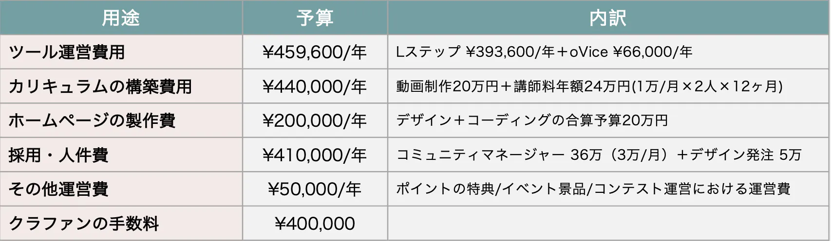 上記の資金は1年分(1期生/2期生)のカリキュラム運営をする際に計上します。