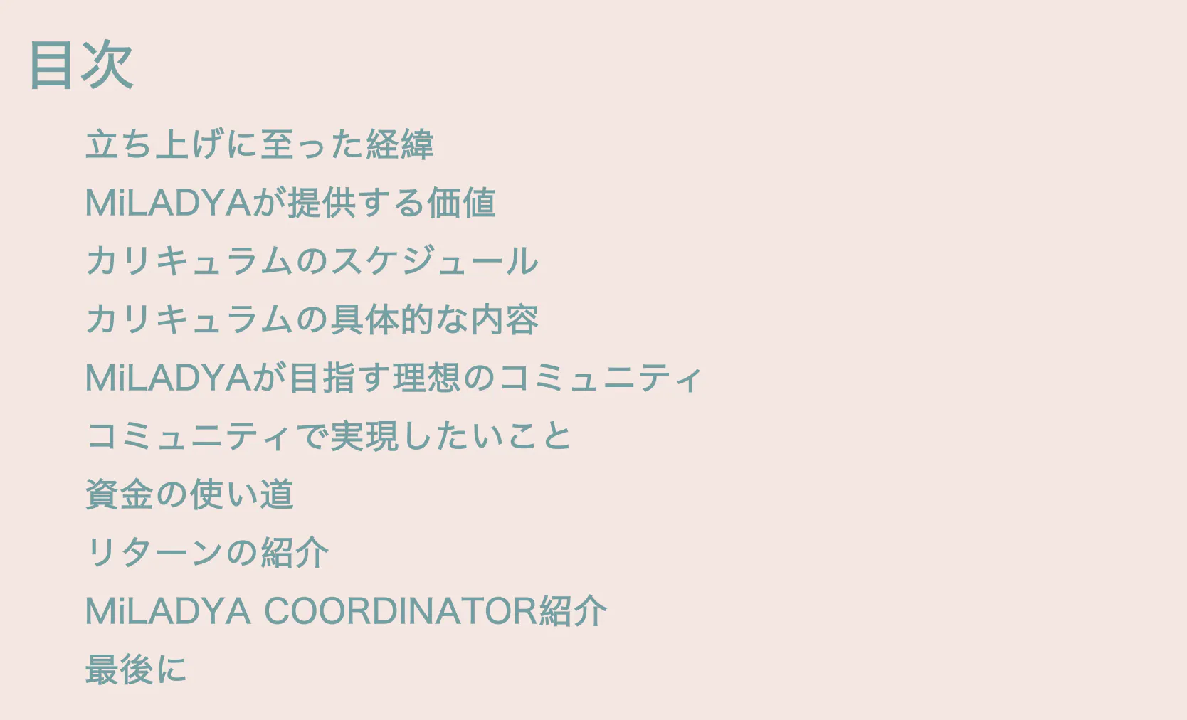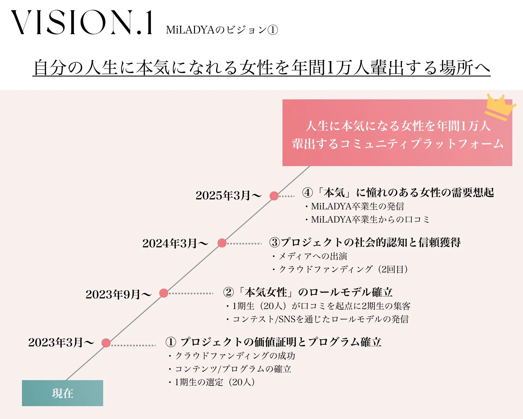 10年、20年後に「MiLADYA」が共通言語となり、飲み会やカフェ会でMiLADYAのことを懐かしみながら話ができる、そんなコミュニティであることを目指します。