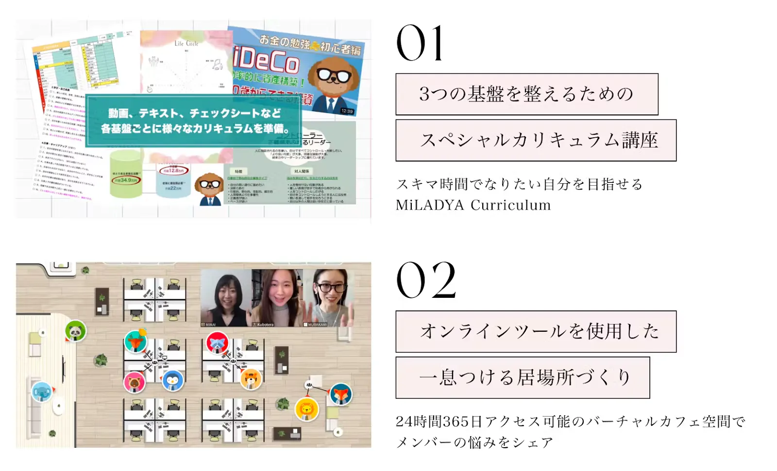 週1回の振り返りワークショップ(オンライン開催)に加えて、不定期でカフェ会やMiLADYAの関係者に限定したVIPパーティなどリアルで開催するイベントを計画しています。