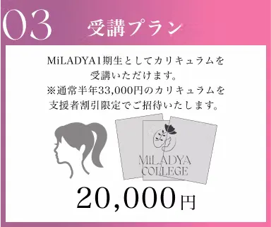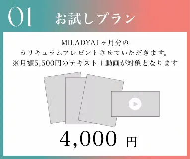 MiLADYAがちょっと気になっている方に向けたプランです。カリキュラムの一部をプレゼントさせていただきますので、よりMiLADYAの内容を知っていただけます。