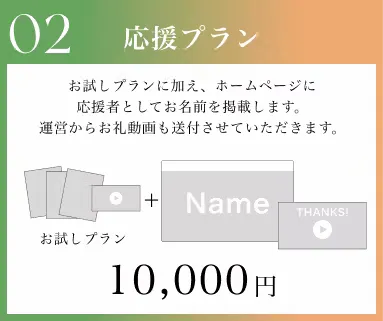 MiLADYAを応援したいという方に向けたプランです。一緒に女性の活躍を応援していただける方の名前をHPに掲載させていただきます。