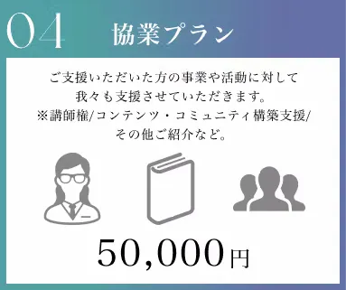 今回のクラウドファンディングは大きく①お試しプラン、②応援者プラン、③受講プラン、④協業プラン、⑤スポンサープランの5つをご用意させていただいております。