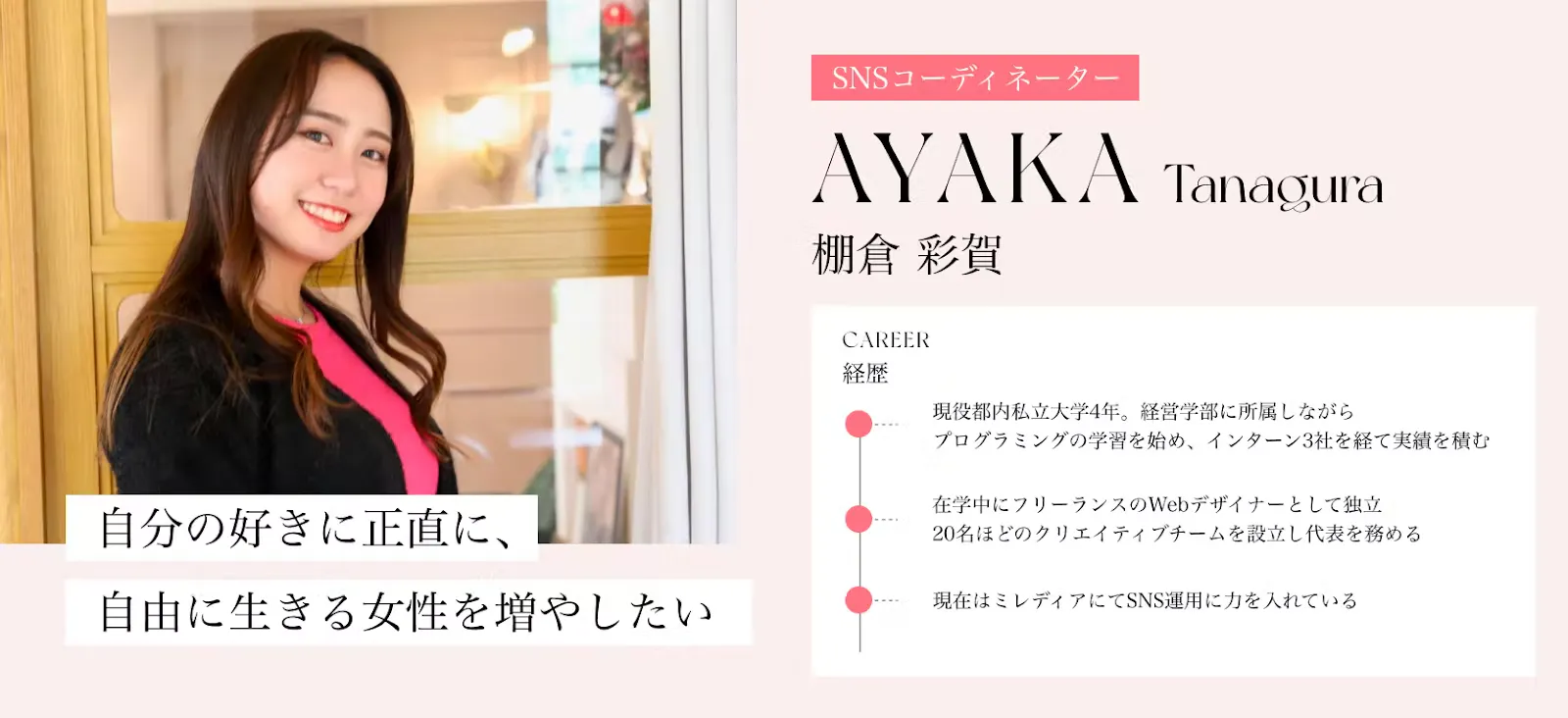 わたし一人では成し遂げられないような多くの女性を輝かせることができると確信し、一緒にMiLADYAをそんな理想のコミュニティにしていくお手伝いがしたいと心から思い、これまで一緒に運営として関わって参りました。