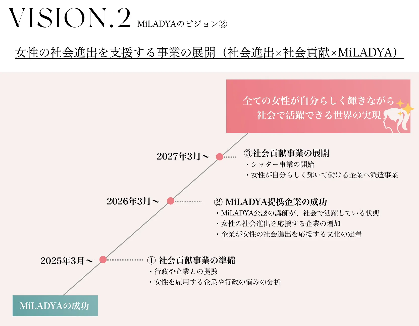 MiLADYAコンテストについては2月より企画を準備し、1期生のカリキュラムが終わるタイミングでMiLADYAの一大イベントとして告知し、受講いただいた費用を用い、女性が夢中になるお祭りのようなものに仕上げれたらと思っています。