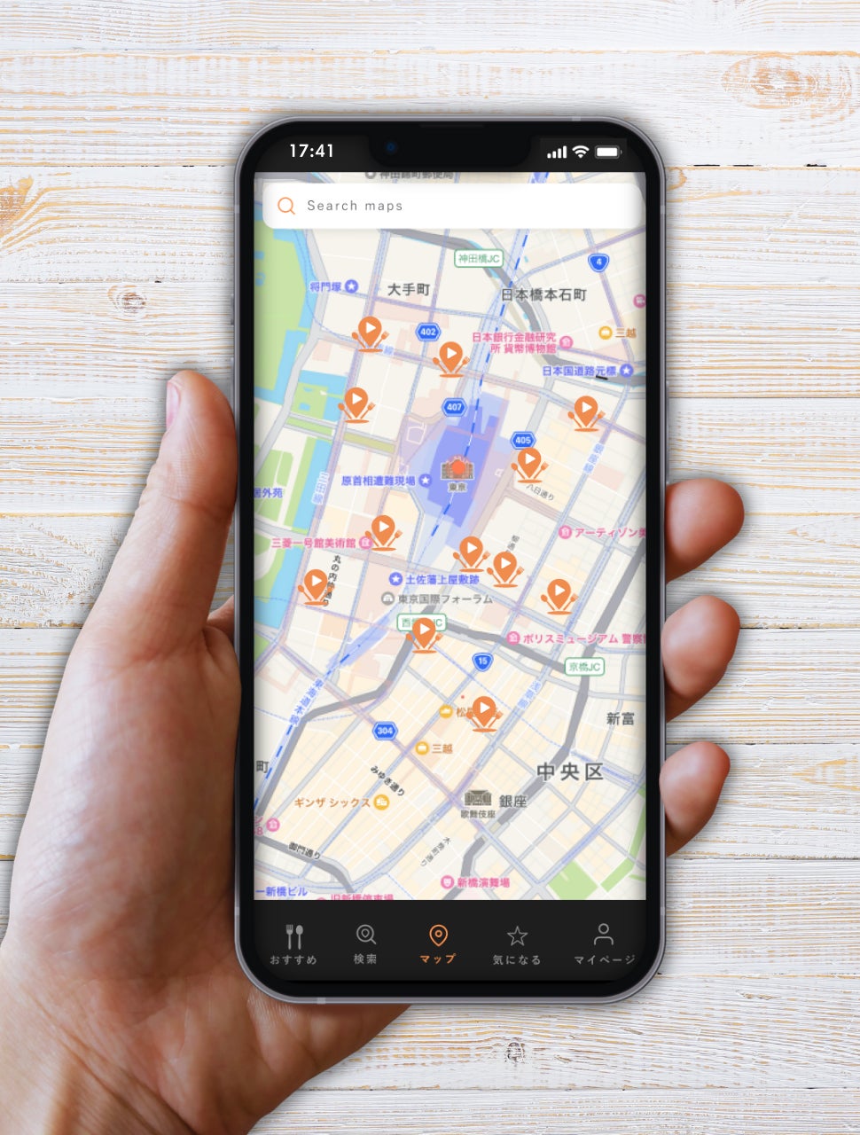 アプリにログインすると上記のトップページが開きます。トップページでは、位置情報を元に現在地の近くにあるお店の投稿動画がおすすめ表示されます。