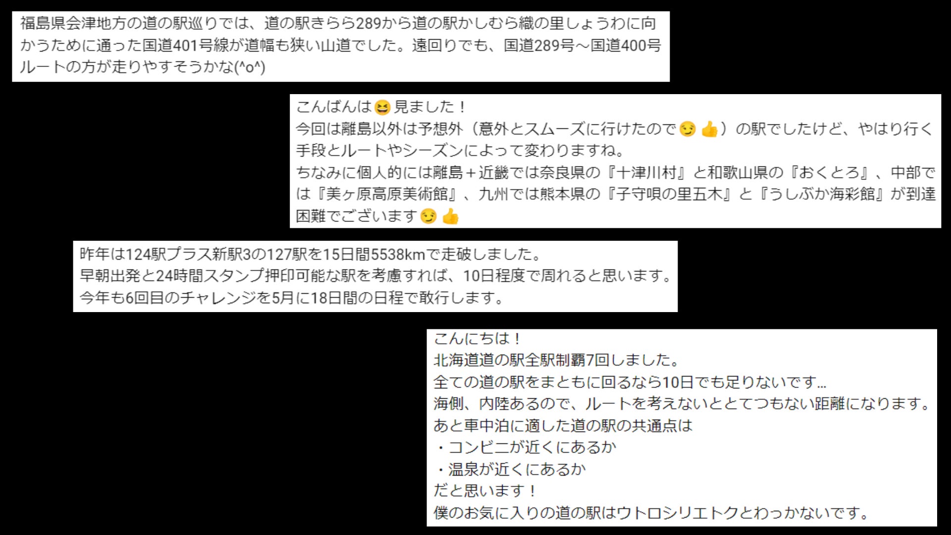 また我々のチャンネルには道の駅好きは勿論のこと、車中泊好き、バイク好き、旅行好きな視聴者さんが多く、我々が持っている知識の遥か上の膨大な知識を持った視聴者さんが多いです。