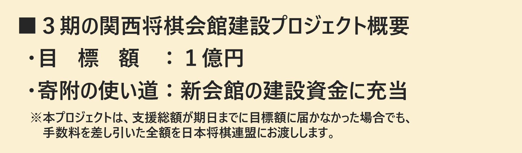 集まったご寄附については、CAMPFIREのサイト手数料を差し引いた全額を、基金に積み立て、新会館の建設支援として日本将棋連盟にお渡しさせていただきます。本プロジェクトは、支援総額が期日までに目標金額に届かなかった場合でも、手数料を差し引いた全額を日本将棋連盟にお渡しします。